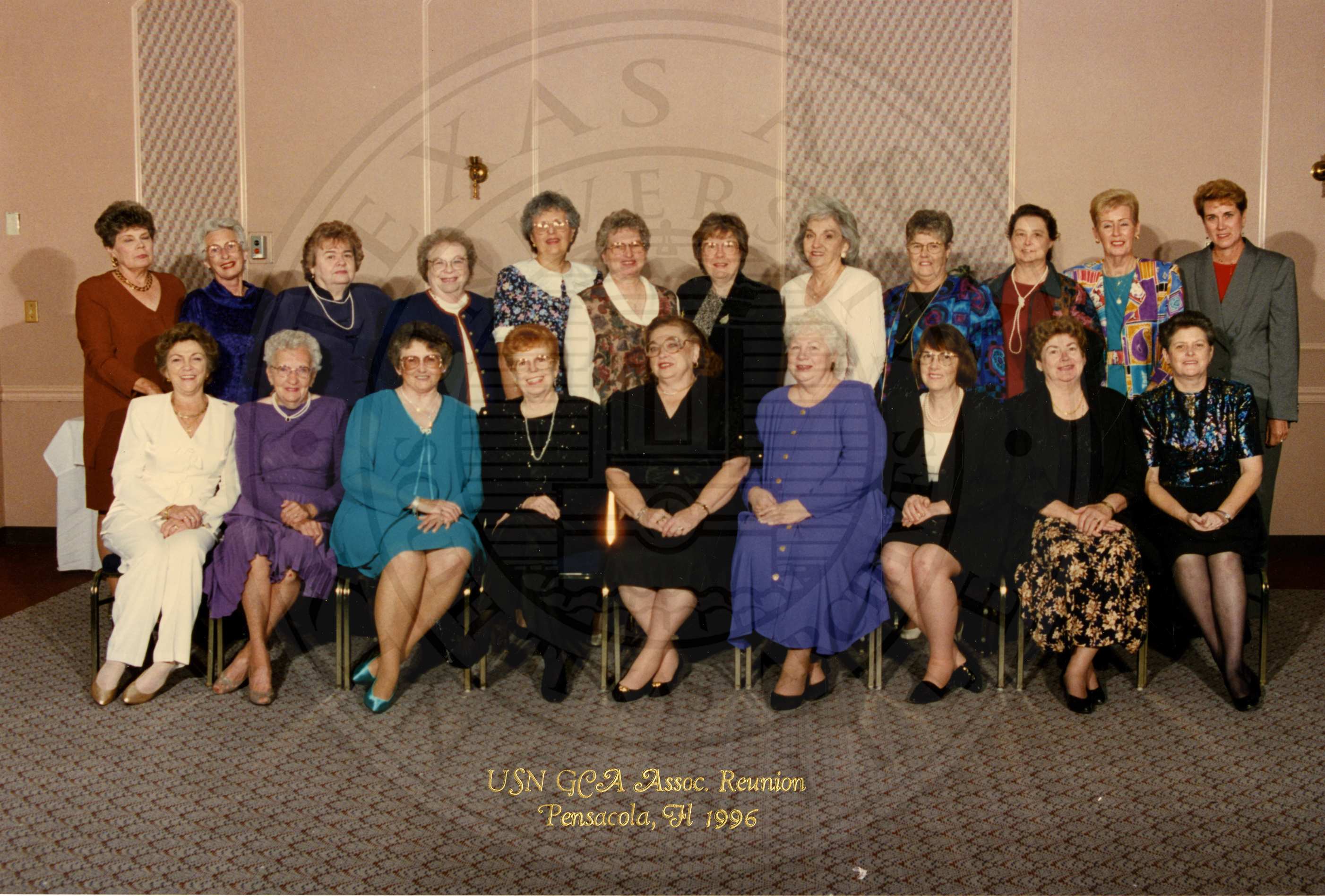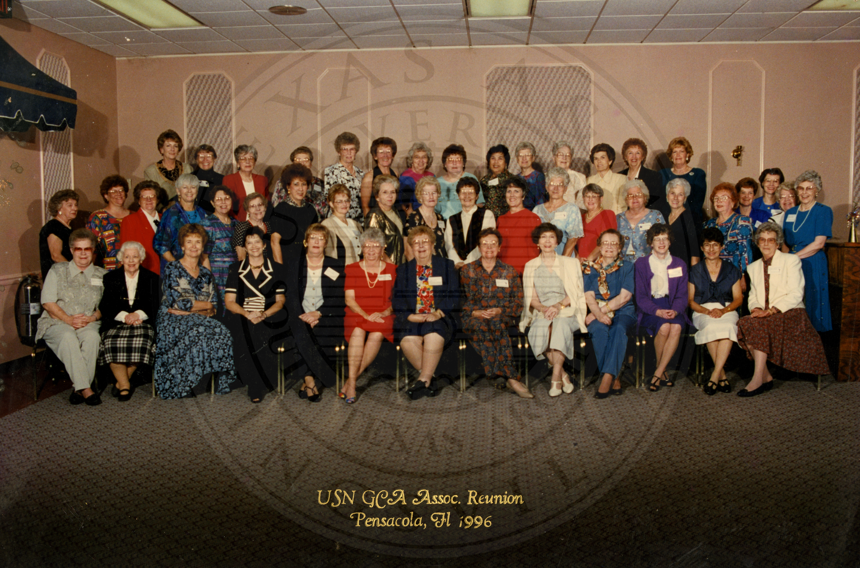 Caption: "USN GCA Assoc. Reunion. Pensacola, Fl". Large group of unidentified women |