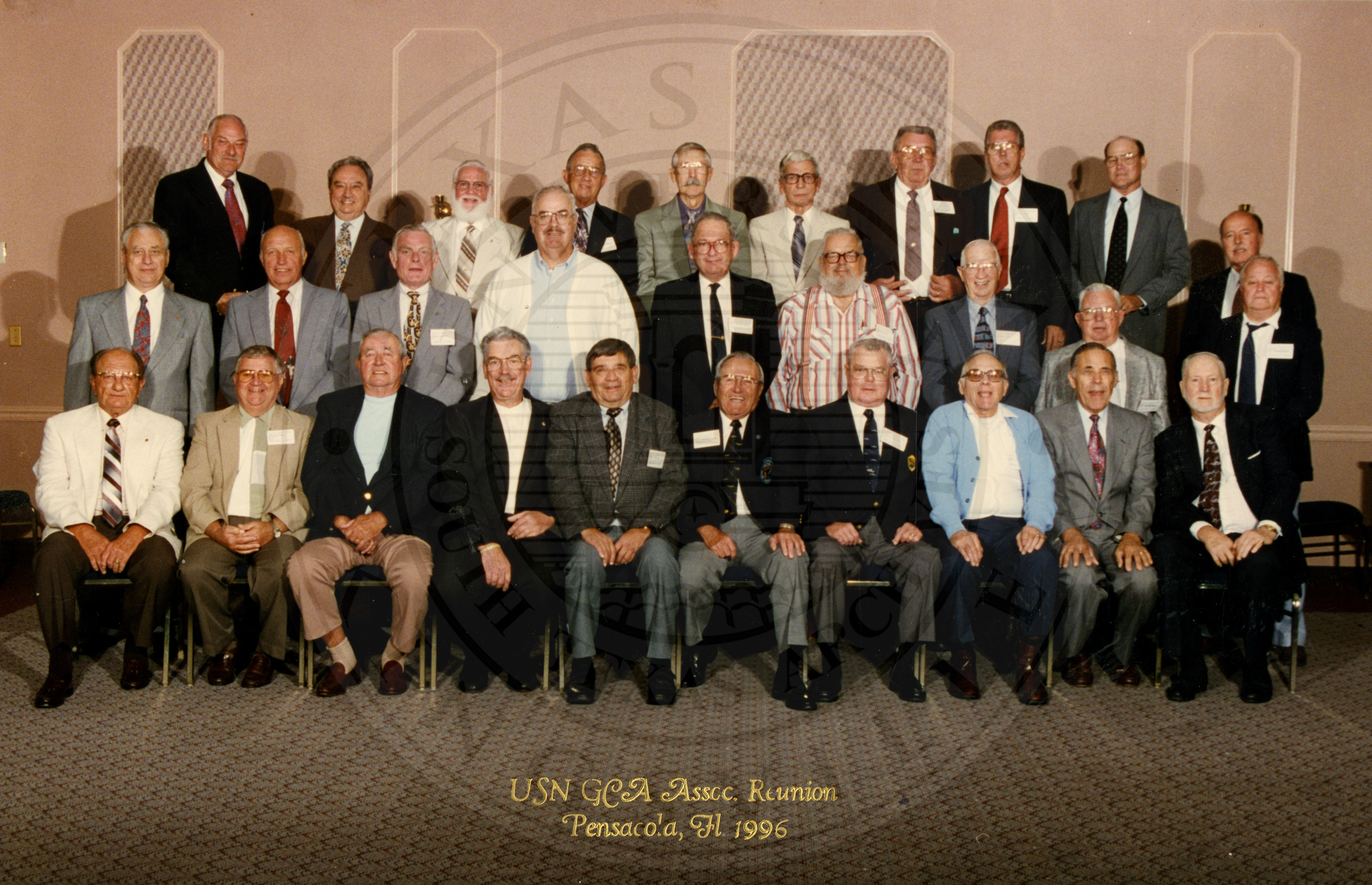 Caption: "USN GCA Assoc. Reunion. Pensacola, Fl". Large group of unidentified men |