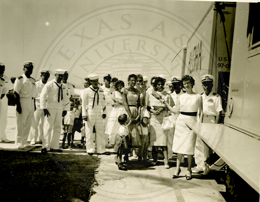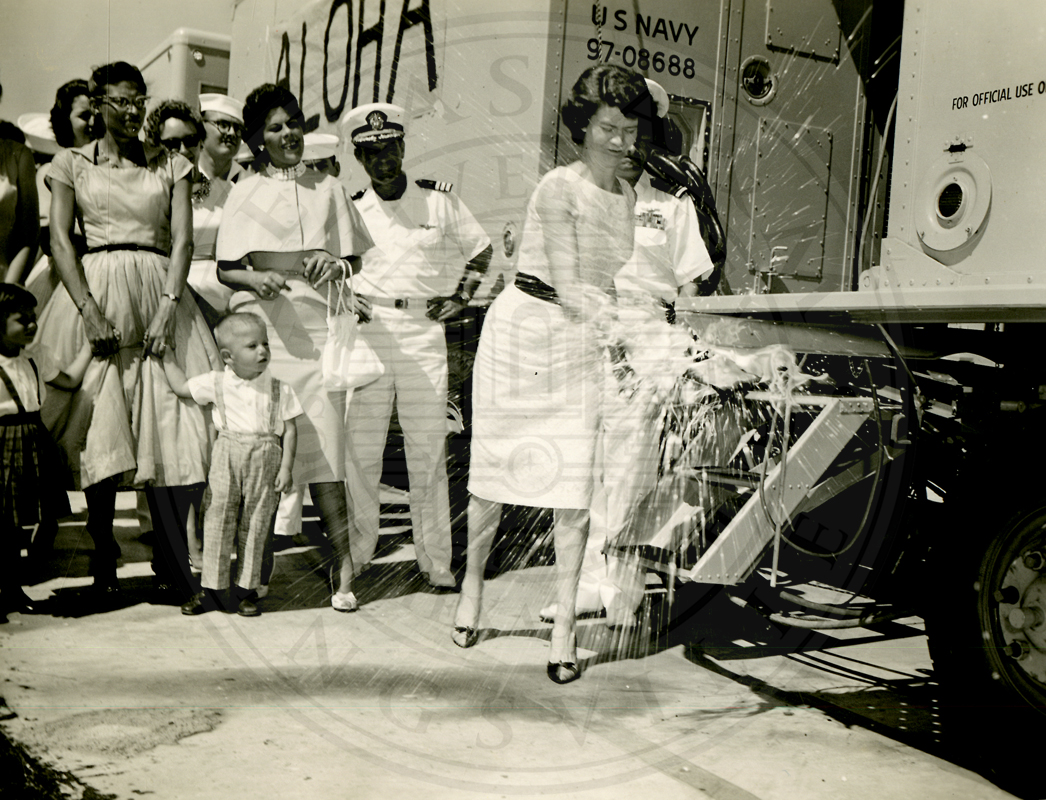 Midway Island. AN/CDN-4. Several unidentified sailors, women, and children. The woman in the front is smashing a bottle of champagne on a GCA (Ground Controlled Approach) radar unit |