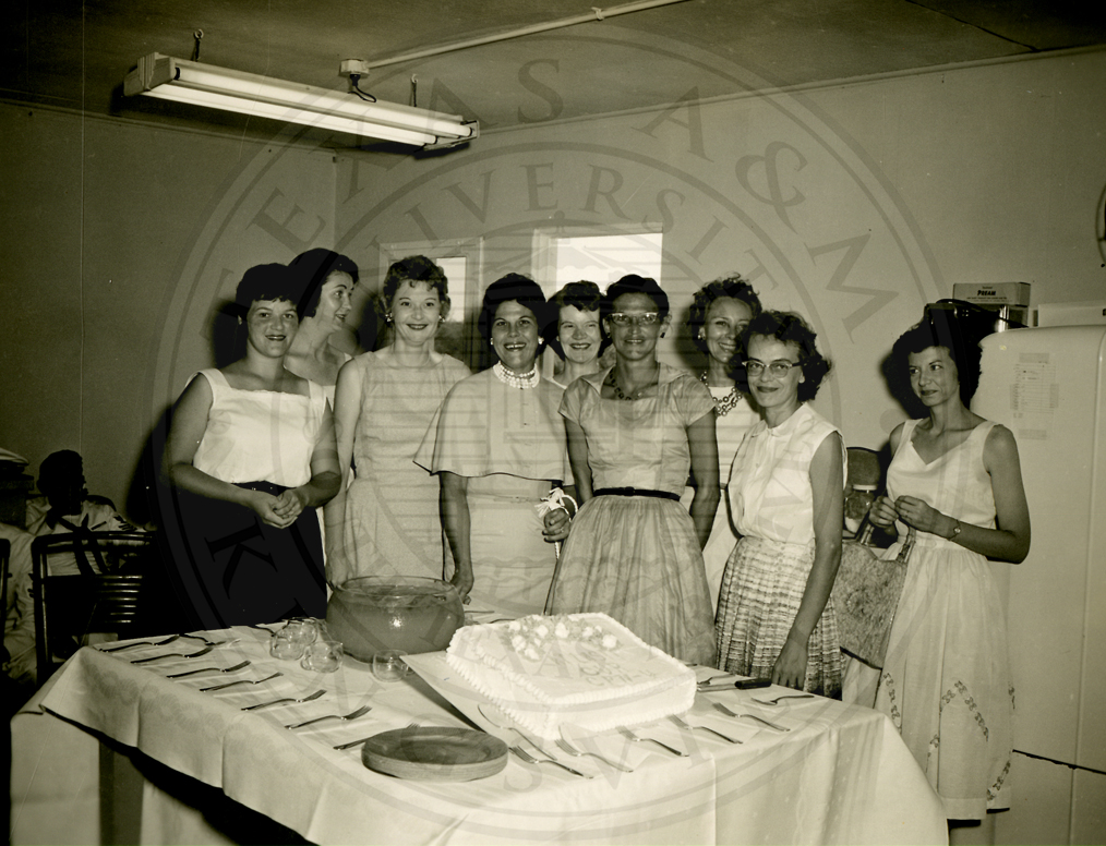 Midway Island. AN/CDN-4. Nine unidentified women standing next to a table with a cake on it |