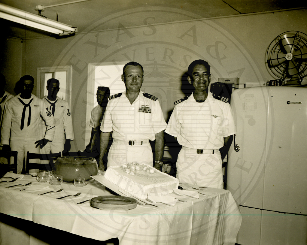 Midway Island. AN/CDN-4. Six unidentified sailors, standing next to a table with a cake on it. |