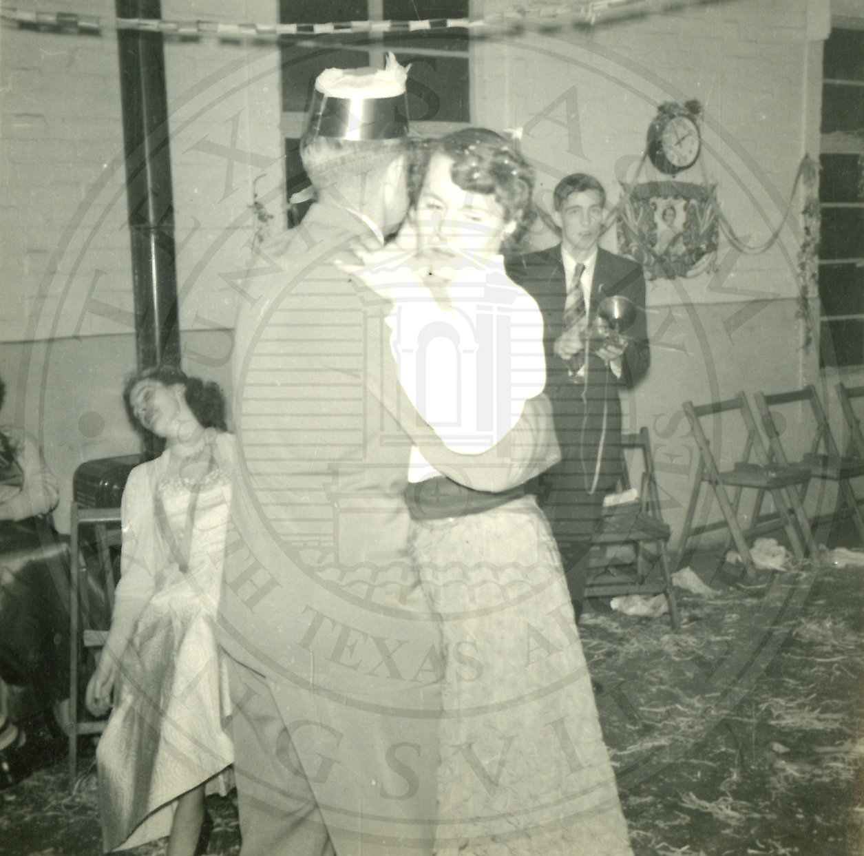 Couple dancing in the center of the photo, woman on left sitting passed out, and man on right standing with camera in hand |