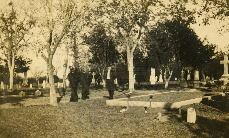 Back says “This is the Catholic cemetery of Victoria. Anderson, Grant and myself. Roy took this ? a lovely place for a picture, isn’t it?” B/w. 3.25 x 5.5 inches