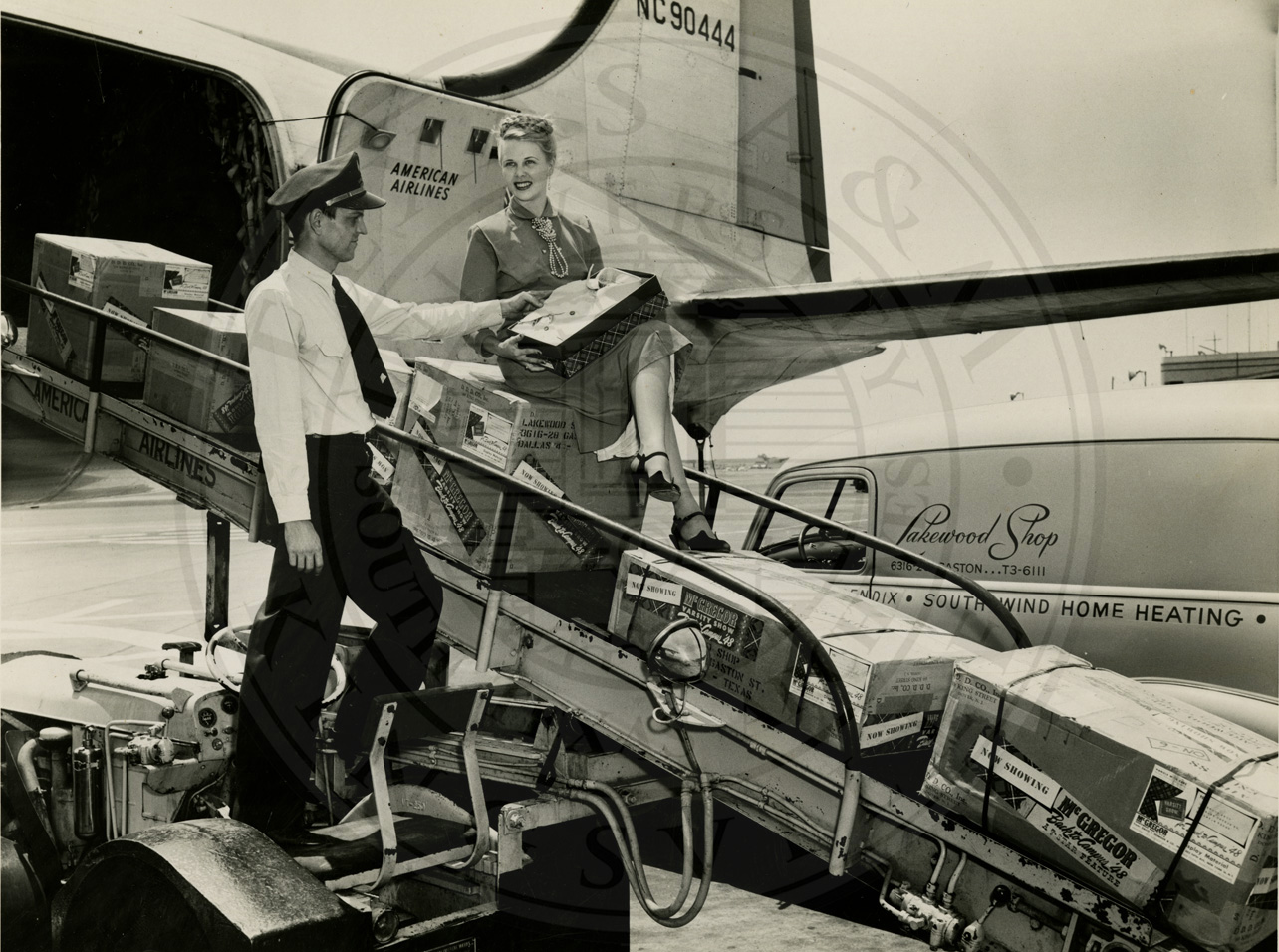 DaMar More sitting on steps of American Airlines plane with many packages and pilot. B/w. 8x.10”