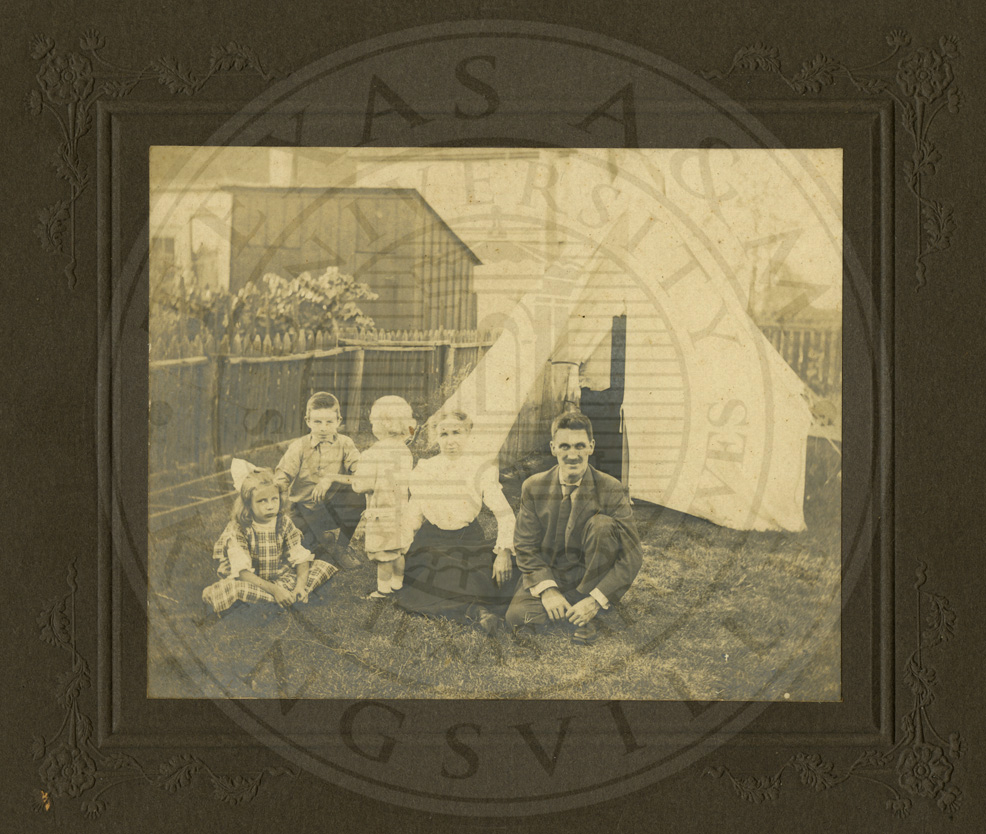Back yard of same house as in #48 & #49. Family sitting in trong of tent. Ca 1902. b/w. 4.75 x 3.75” |