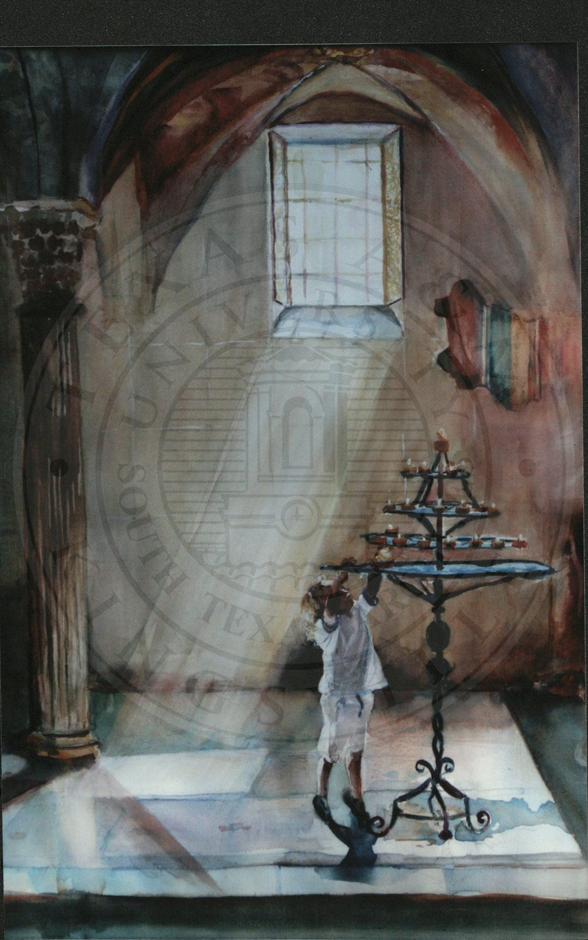 A watercolor of a young boy playing in a fountain. The painting is entitled, "Little Boy in Church." |