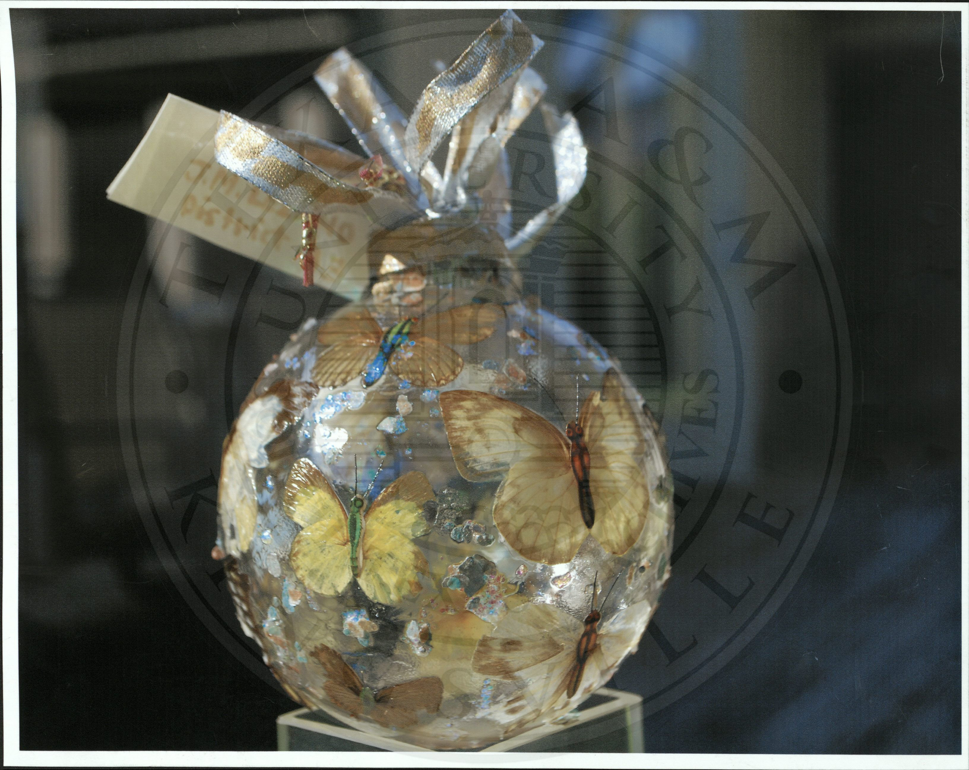 This is a Christmas ball made for the Texas Congress. J. Lazano asked Dolores to do this. This ball represented Kleberg County. |