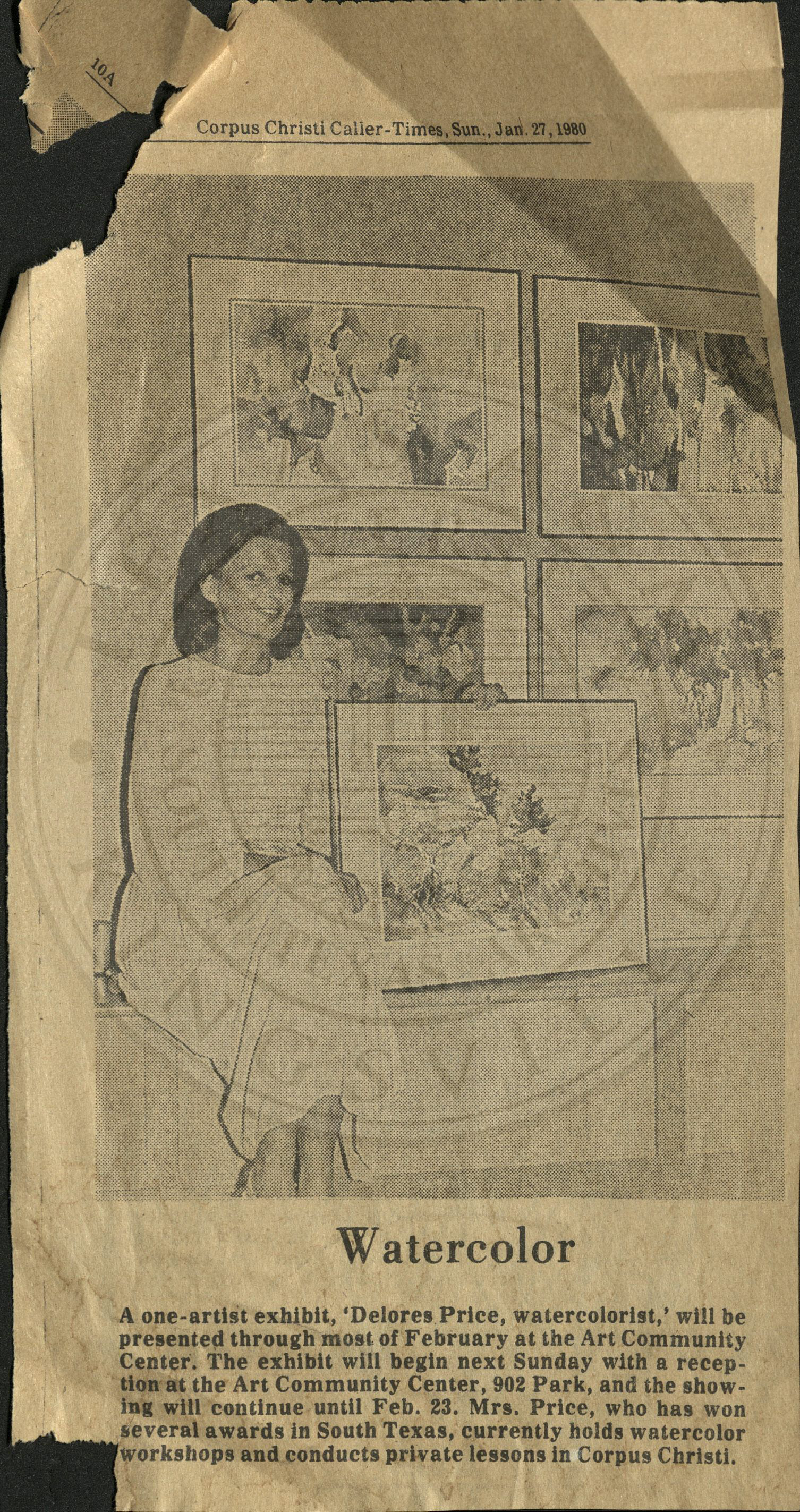 Corpus Christi Caller Times, Sunday., January 27, 1980. An article about Dolores Price and her one-artist exhibit. |