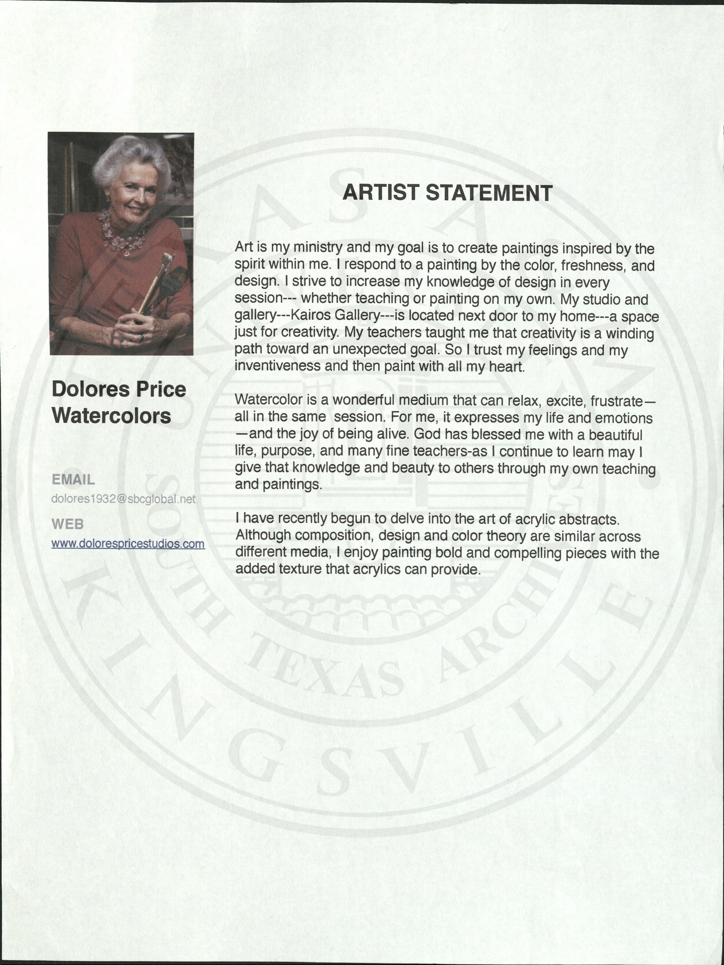 This is not a comprehensive list but here this is a list Dolores Price's professional background, selected exhibitions, selected collections, gallery shows, professional memberships, and personal background through the year 2000. |