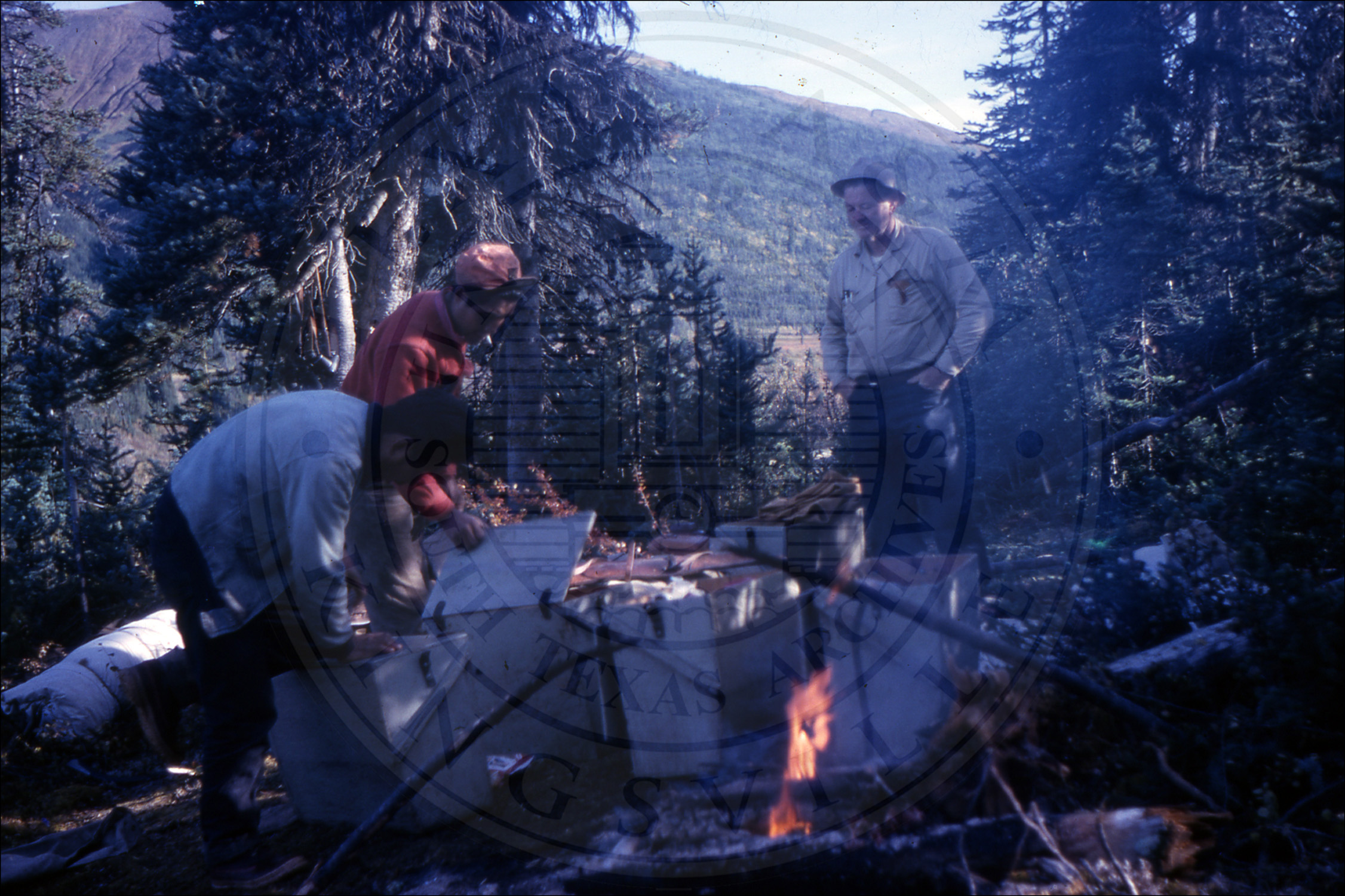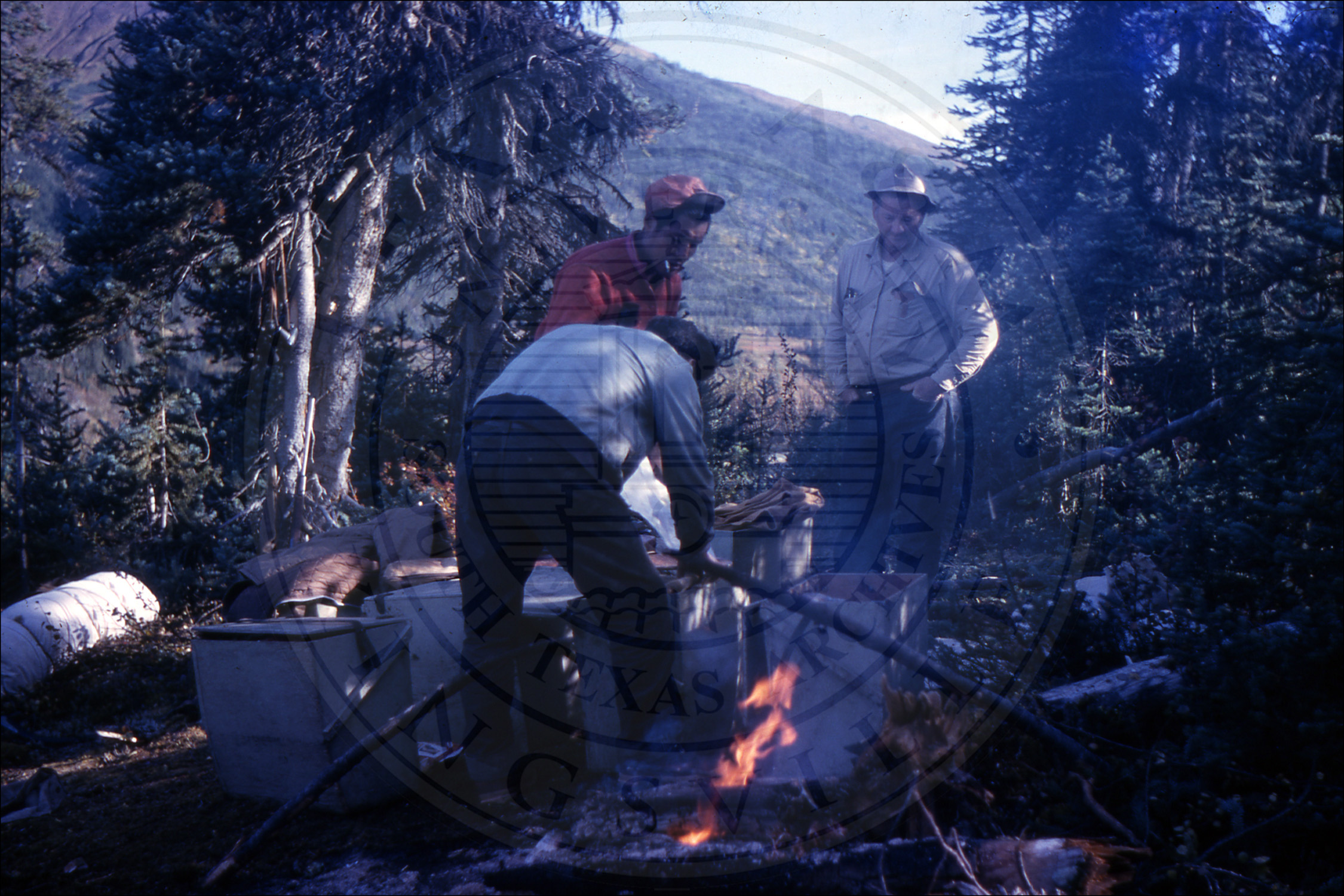 Three men on a camp and fire |