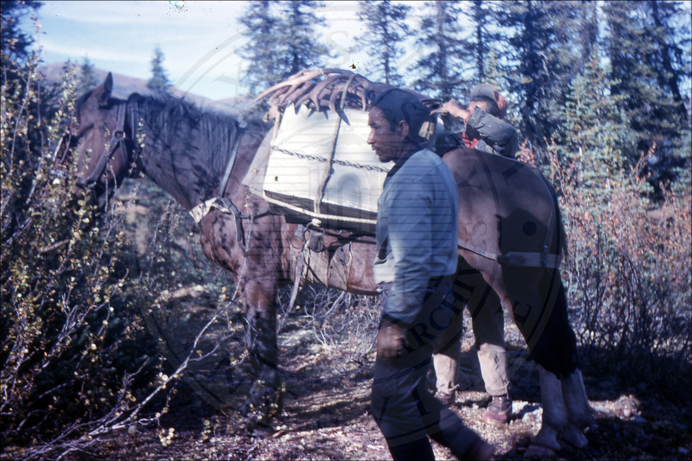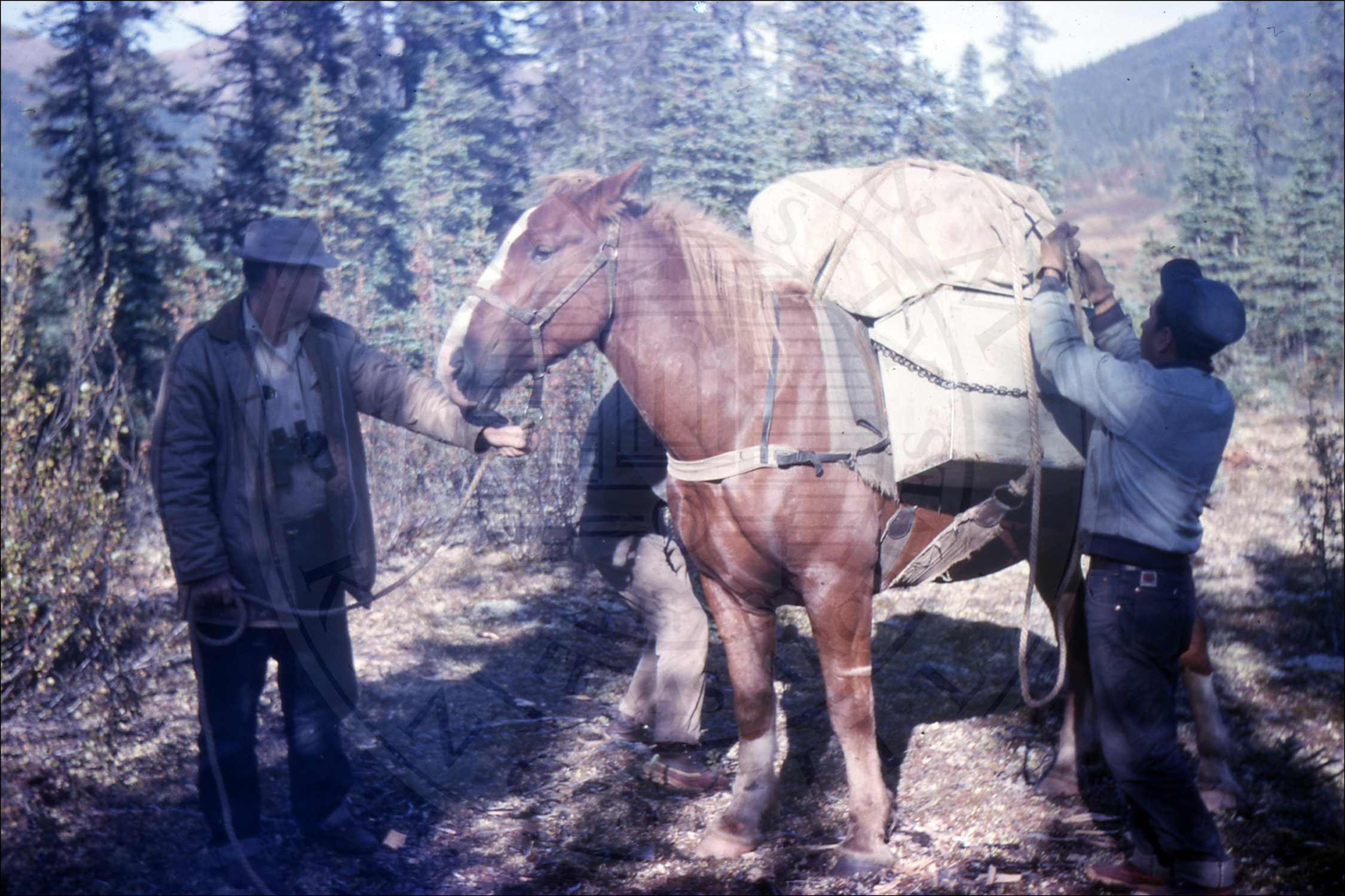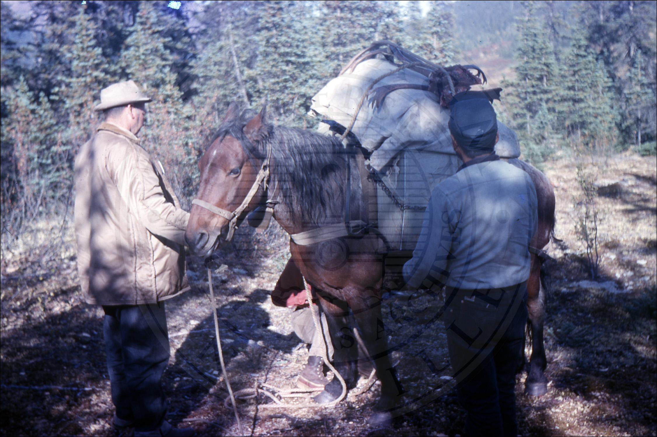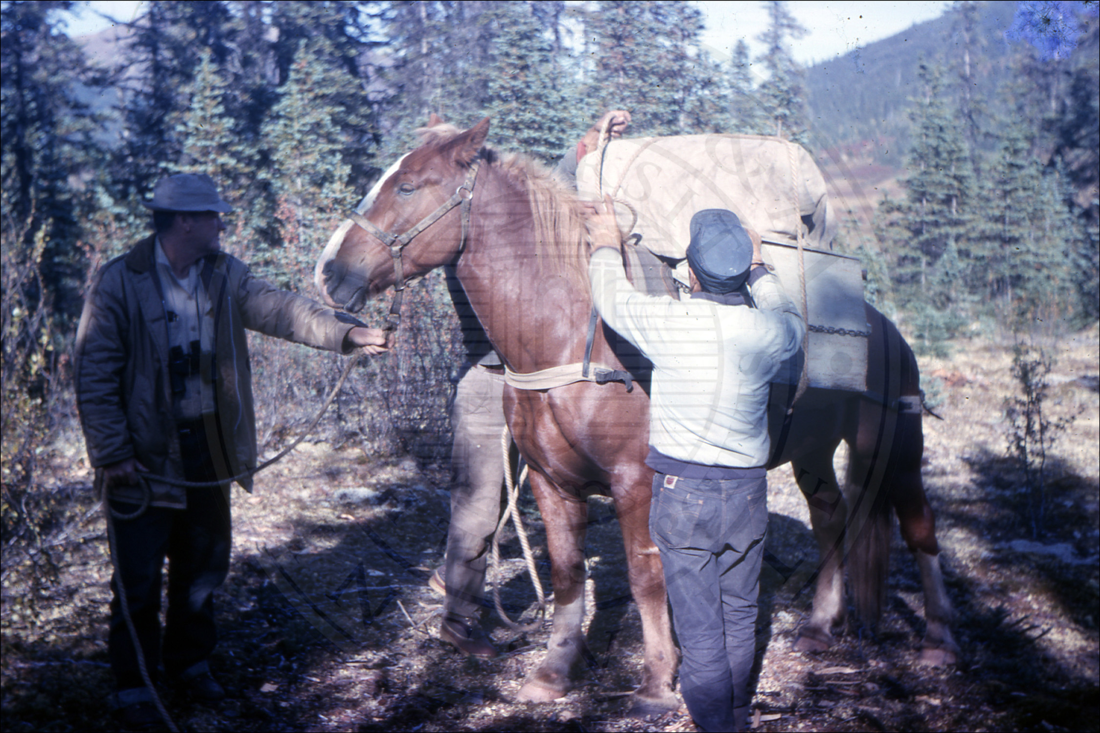 Three men packing a horse |