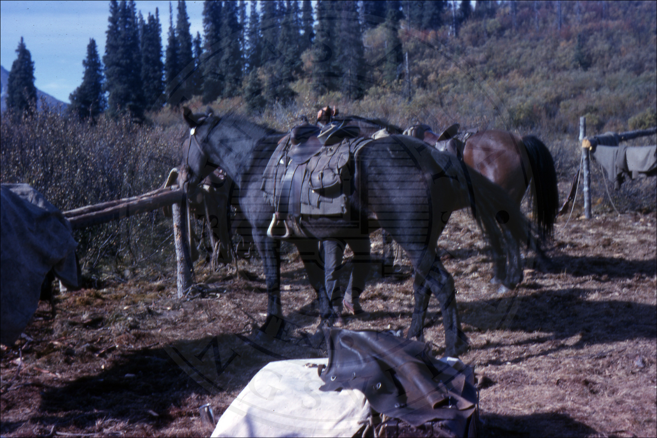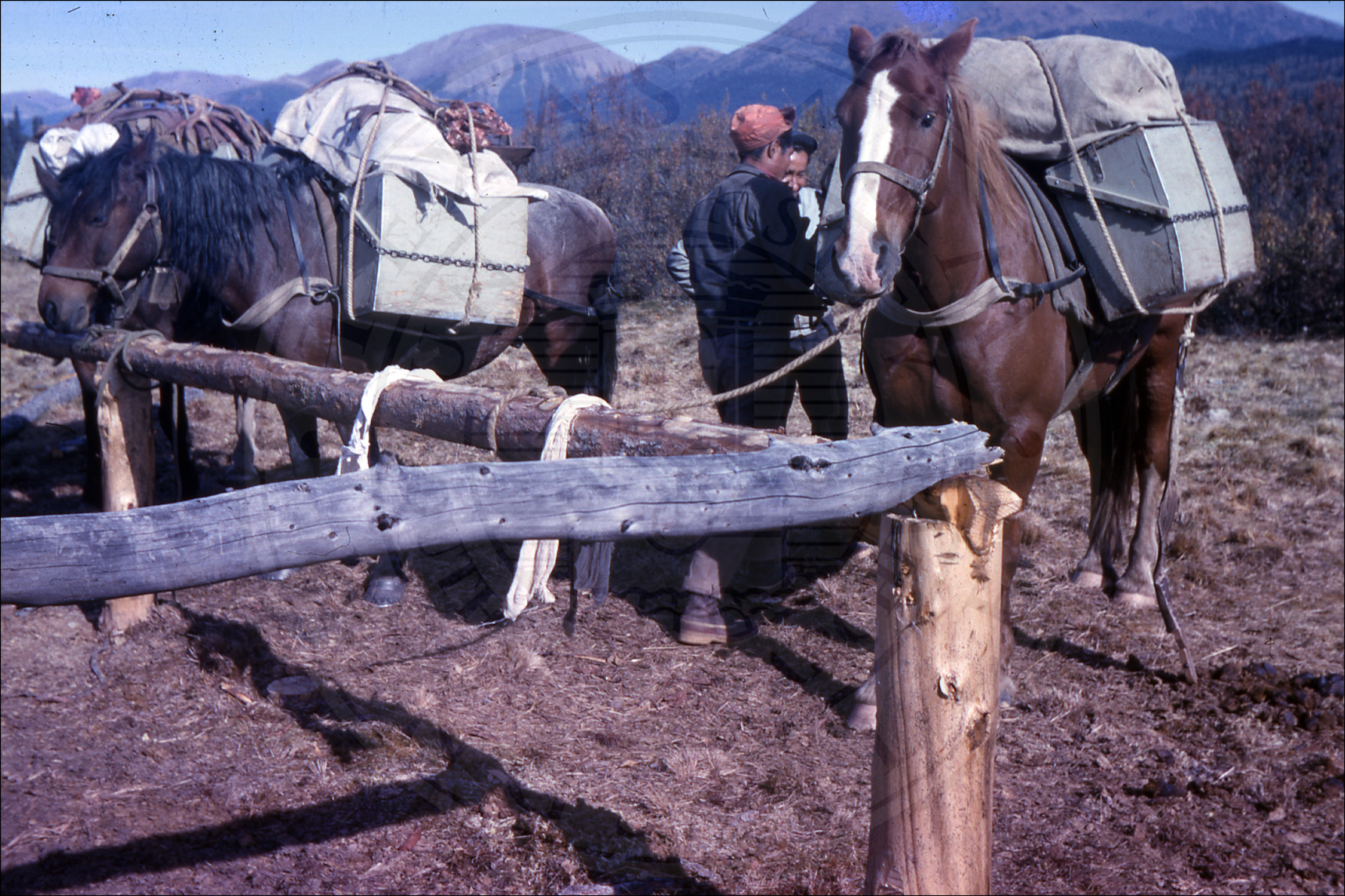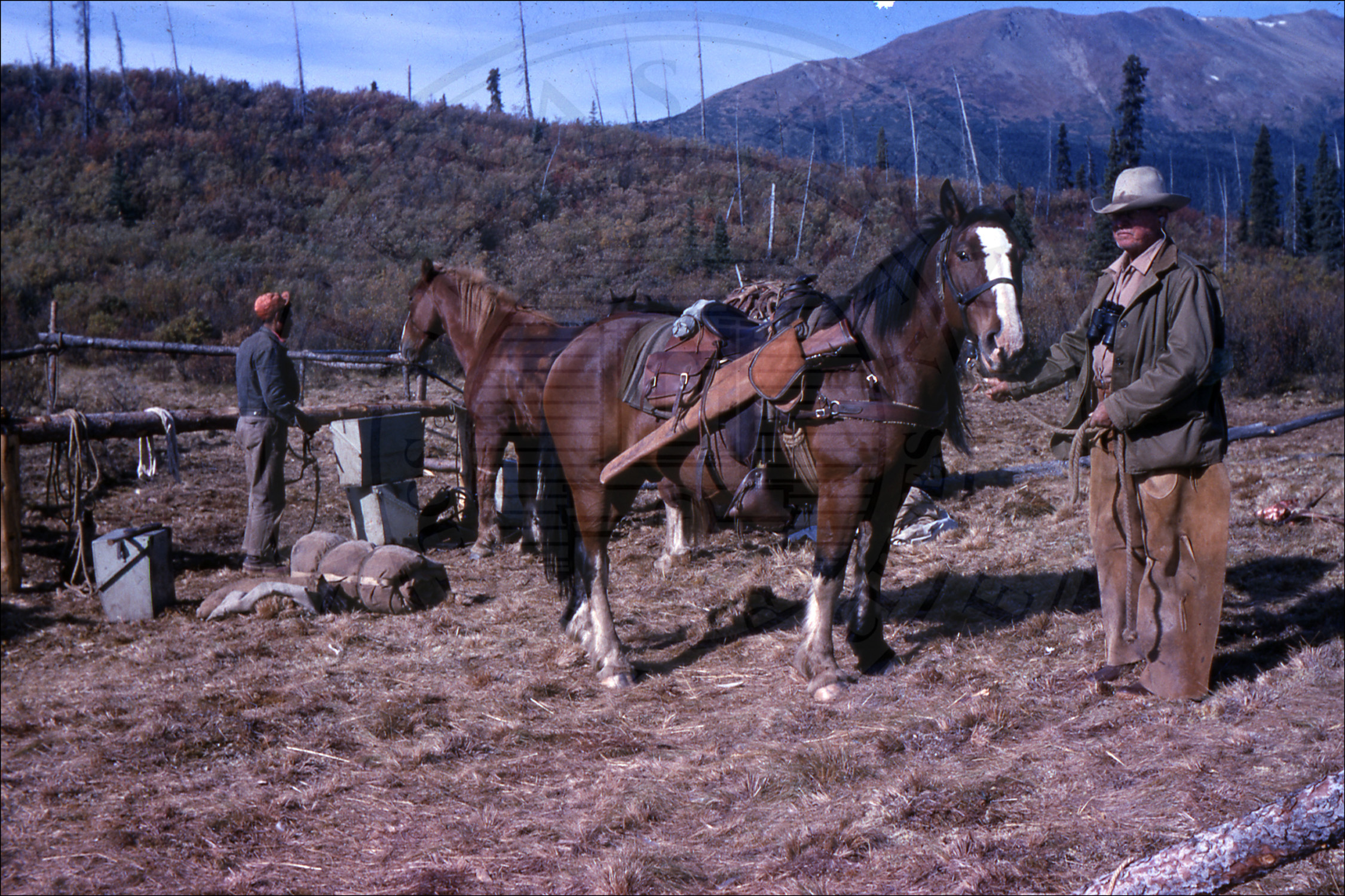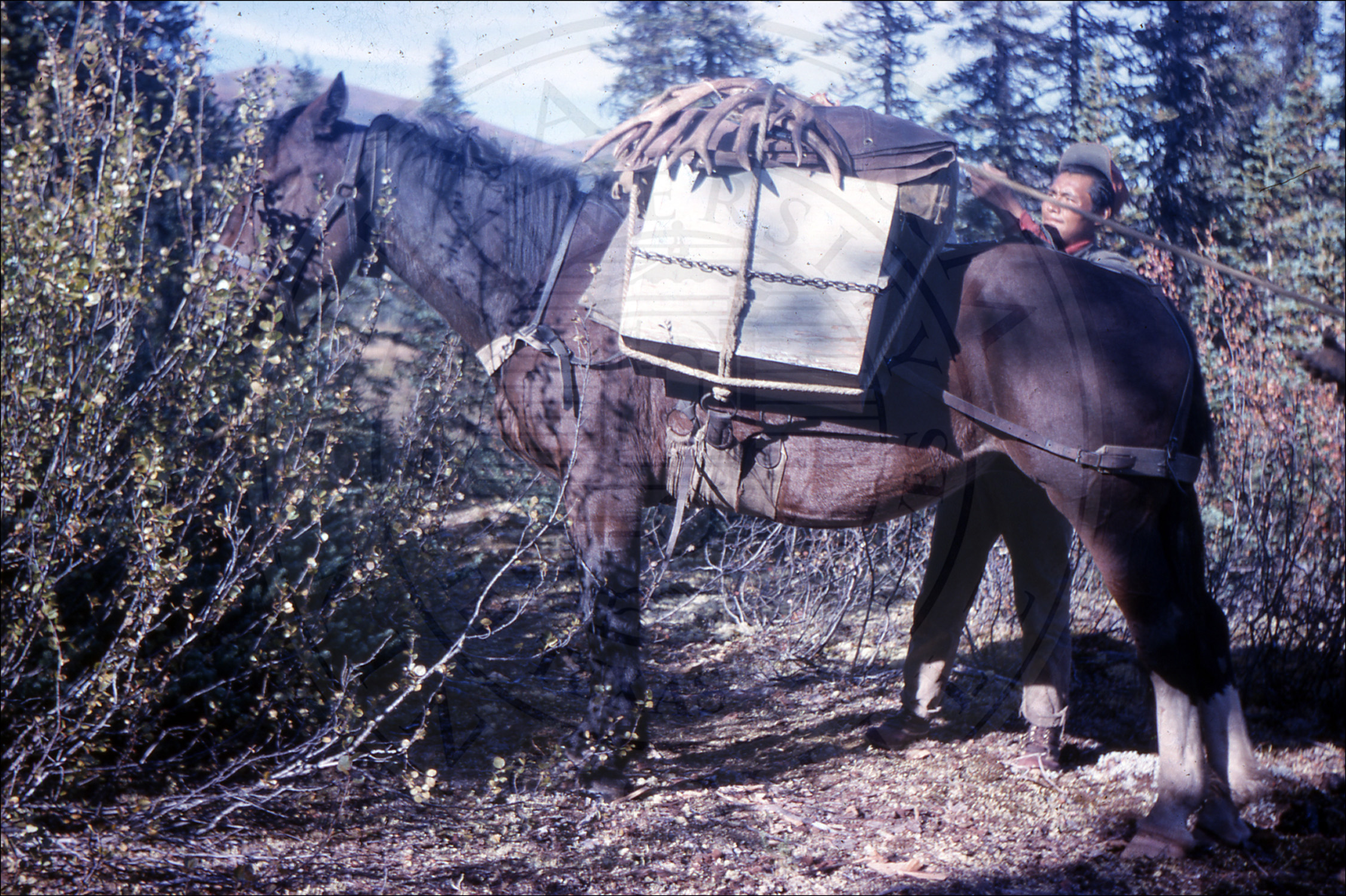 Three men packing a horse |