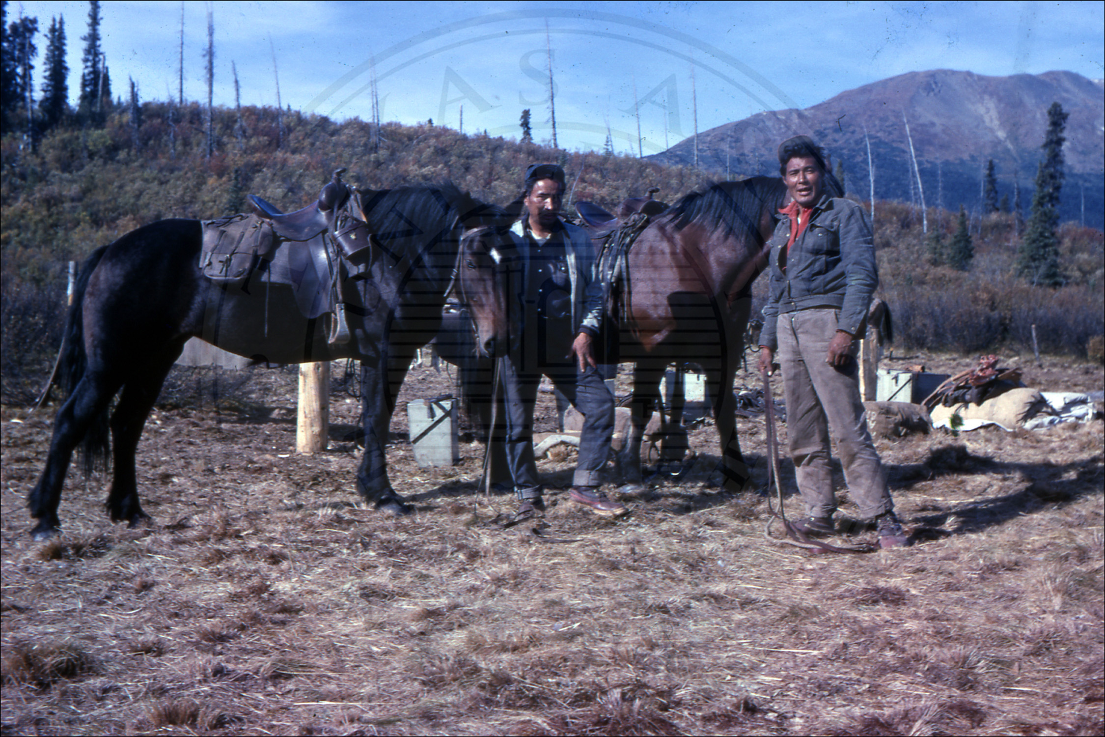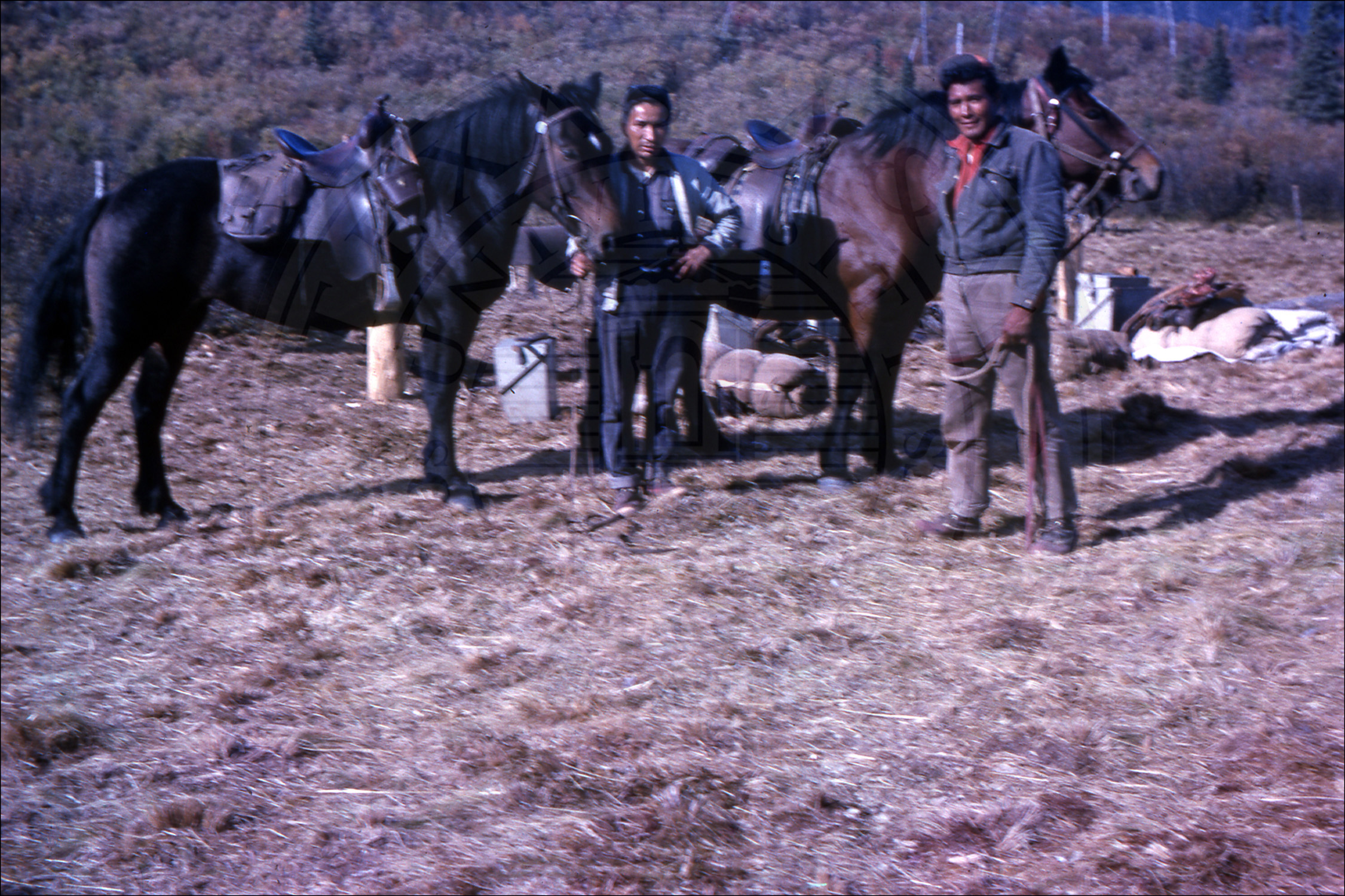 Two men and two horses. |
