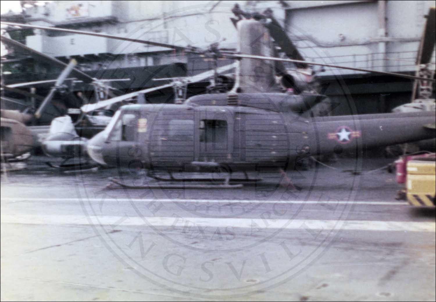 Helicopter parked on the deck on the U.S.S. Midway. |
