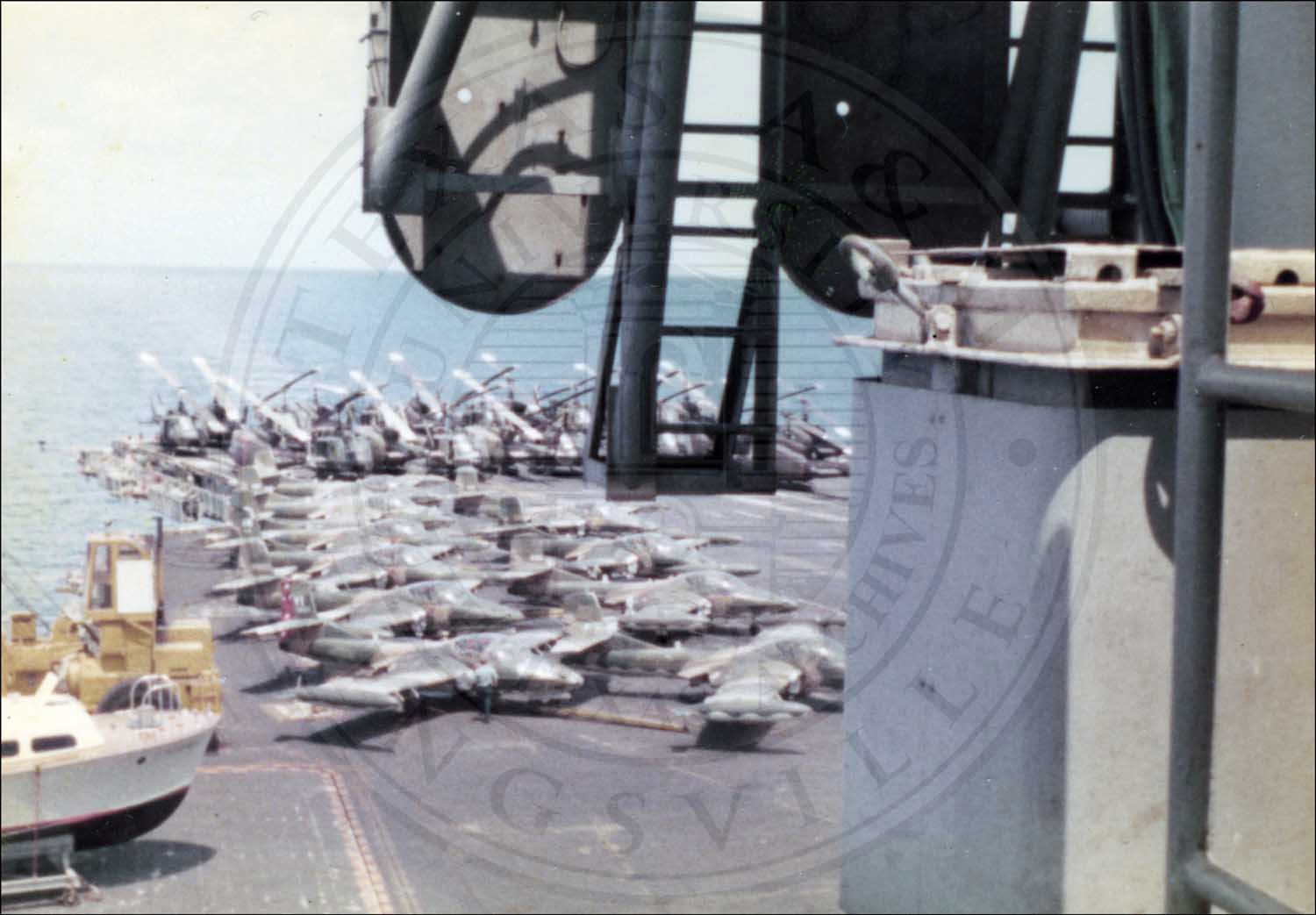 Multiple U.S. military jest and helicopters on the deck of the U.S.S. Midway. |