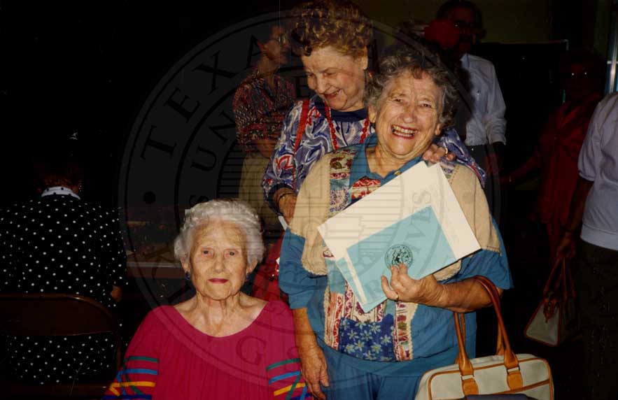 Photo of a woman on the very left sitting down in a chair wearing a pink shirt. She's looking at the camera and smiling. Two women next to her the woman in the back is smiling down at the woman sitting down, and has her left hand on the shoulder of the woman in front of her. To woman closest to the camera standing is smiling towards the camera and holding papers in her hands. In the back people are visible conversing |