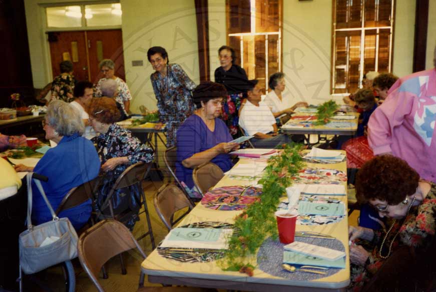 Picture of a room with multiple tables with place mats on them. Women are all over the room sitting at tables, one woman towards the back left is looking at the camera |