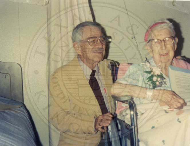 Picture of a man wearing a khaki suit with a brown tie squatting and looking to the right at the woman in the wheel chair. He's smiling at her. The woman on the right is sitting in a wheel chair wearing a blue shirt and a pink sweater with a blanket over her legs. She is looking at the camera, and is holding papers in her hands |