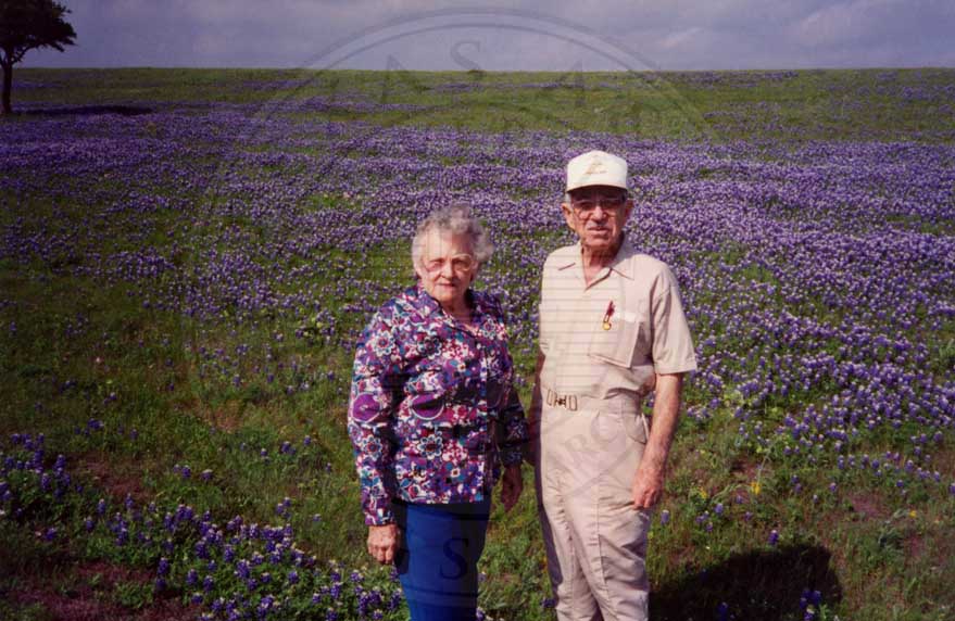 Picture of a man and woman in a field of bluebonnets. The woman is wearing a multi - colored shirt and the man is wearing a khaki shirt tucked into khaki pants and a hat. Both are looking at the camera |