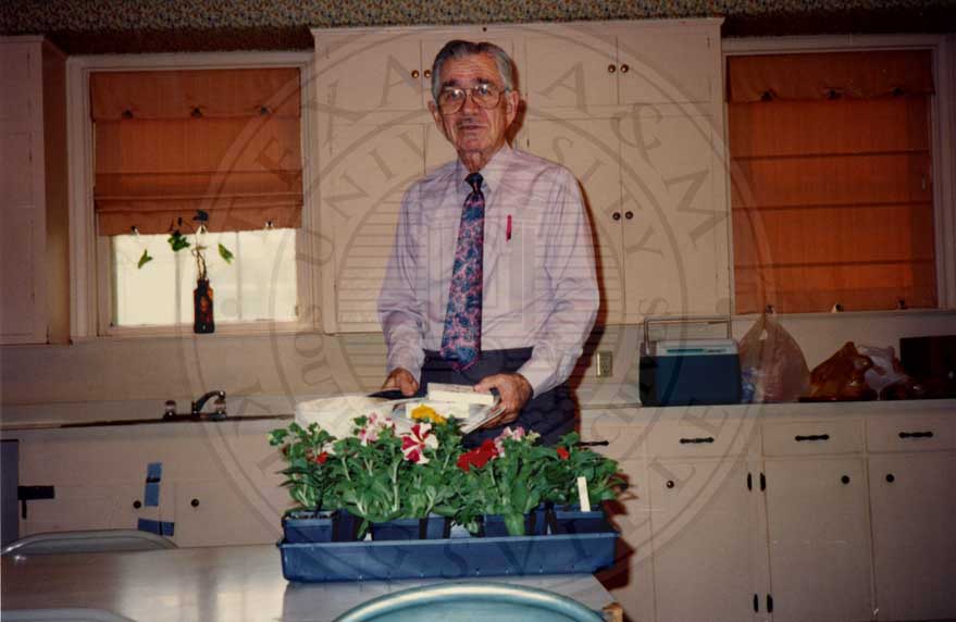 Picture of a man wearing a button down shirt with a blue and pink tie. He's holding books and a hat in his hands. The picture is in a kitchen area, and in front of him a table with flower pots on it |