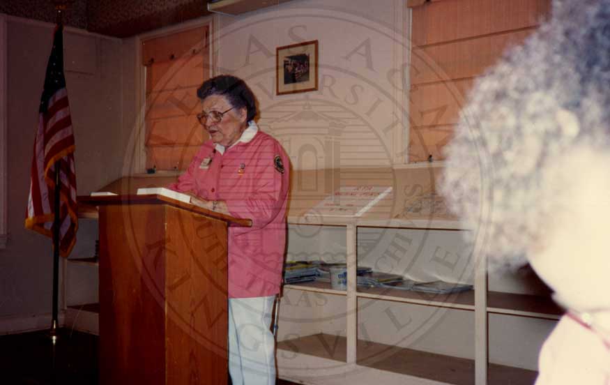 Picture of a woman to the left wearing a pink button down shirt with white pants. She's standing behind a podium looking down and talking. To the very left an American Flag is standing. To the right a white haired lady is visible |