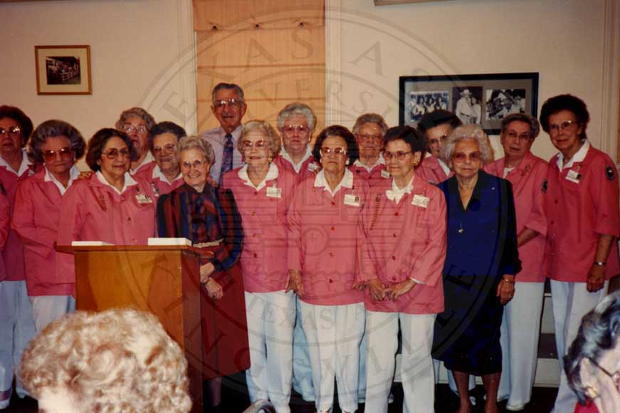 Photo of a group of older men and women. Most women are wearing pink shirts with white slacks, they all have name tags. The men in the center is wearing a purple button down and a tie. Two women in the picture, one on the left and one on the right wearing a red and blue outfit |