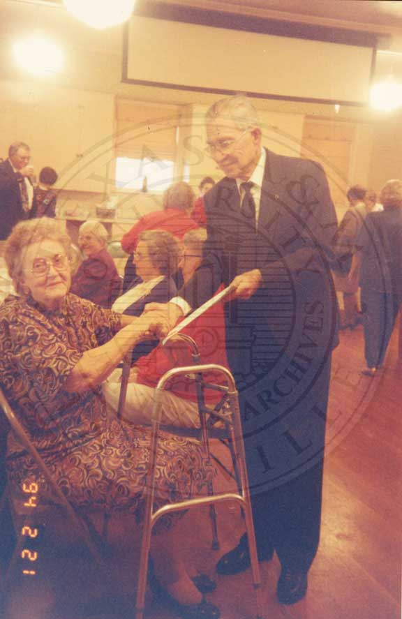 Picture of a woman sitting on the left with a walker in front of her. She's wearing a dress and facing the camera. In front of her a man in a suit handing her a document and shaking her hand. He's looking at her, and in the background a group of people standing and sitting |