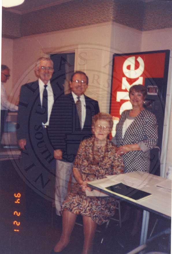 Picture of two men standing on the left wearing suit and ties. In the center a woman in a brown dress sitting and smiling at the camera. To the right a woman standing in a polka dotted dress in front of a coke machine, she's looking at the camera and smiling |