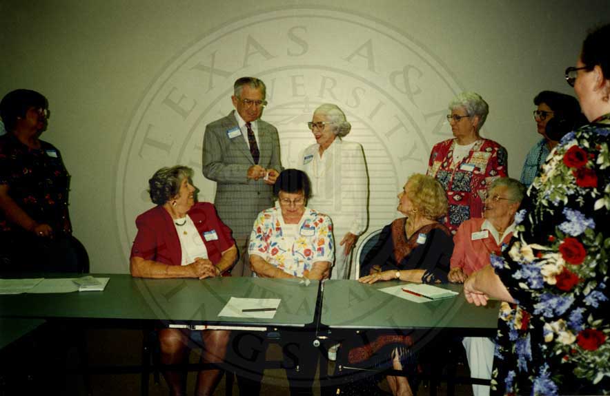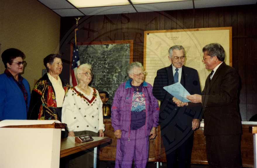 Picture of four older women on the left, looking to the right towards the men. The two men on the right are shaking hands and the man to the very right is handing papers to the man on the left |