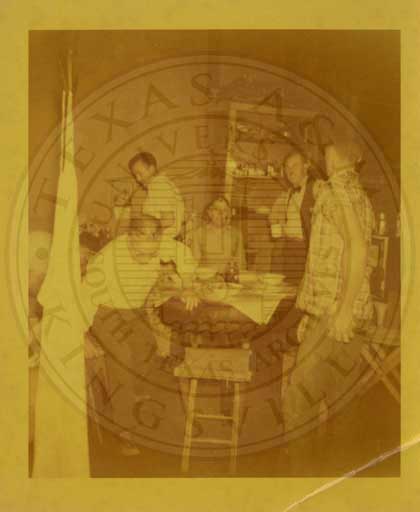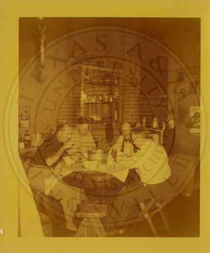 Two unidentified men sitting around a table with Uncle Joe Stelzig, Jim Scarbrough and L.C. McRoberts is on the far right. |
