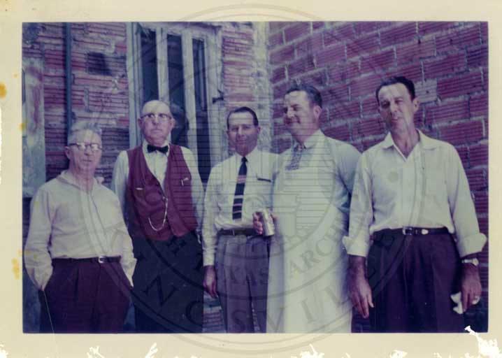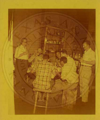 Uncle Joe Stelzig and Jim Scarbrough with three other unidentified men surrounding a table. One sitting down, Uncle Joe Stelzig, one beginning to stand, and three standing one of them is Jim Scarbrough |