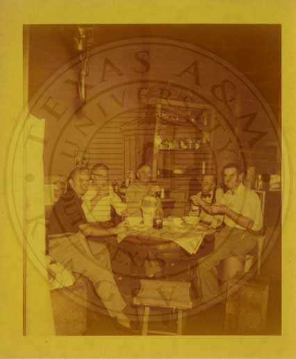 Five unidentified men sitting around a table with Uncle Joe Stelzig and Jim Scarbrough |