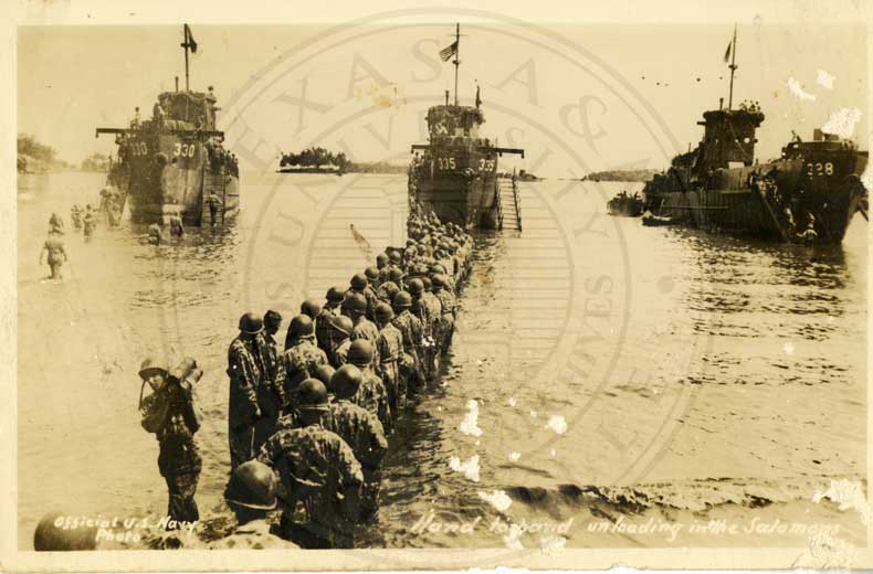 Postcard official U.S. Navy. Soldiers walking through water towards a transport ship |