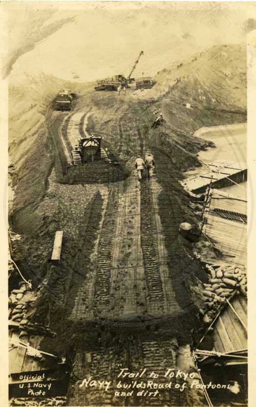 Postcard official U.S. Navy. Bulldozers and crane working on road. Caption "Trail to Tokyo. Navy builds Road of Pontoons and dirt" |