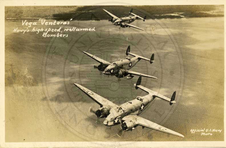 Postcard official U.S. Navy. Flight of three B-24 Liberators flying in echelon formation. Caption "Vega Venturas. Navy's high speed well armed bombers" |