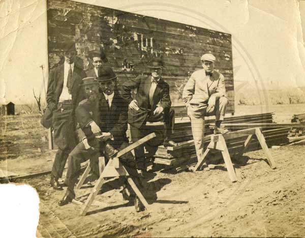 (L-R) M.L. McRoberts, Joe Lawrence, (Will ?) Ragan, and L.C. McRoberts and two unidentified men sitting on a saw horse,dressed in suits looking like gangsters |