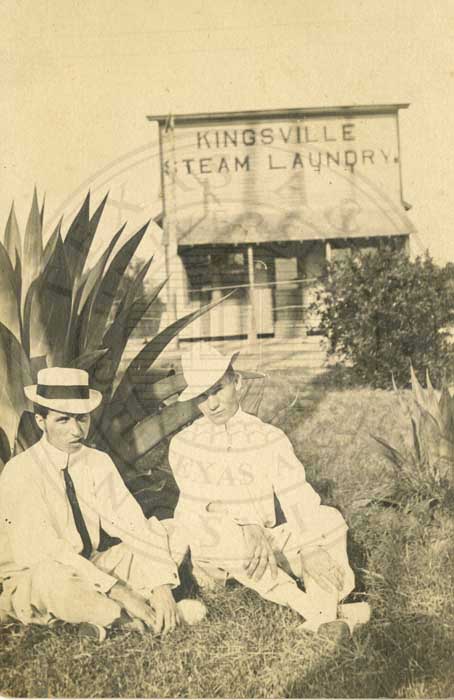 Postcard. (L) L.C. McRoberts and unknown man seated in front of Kingsville Steam Laundry |