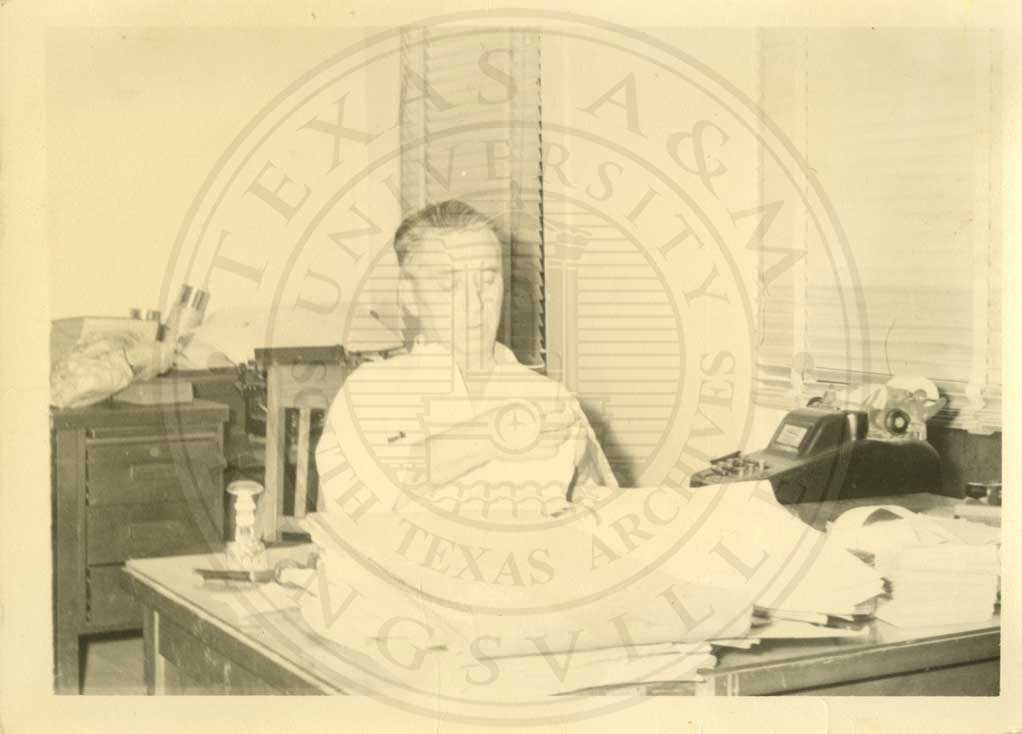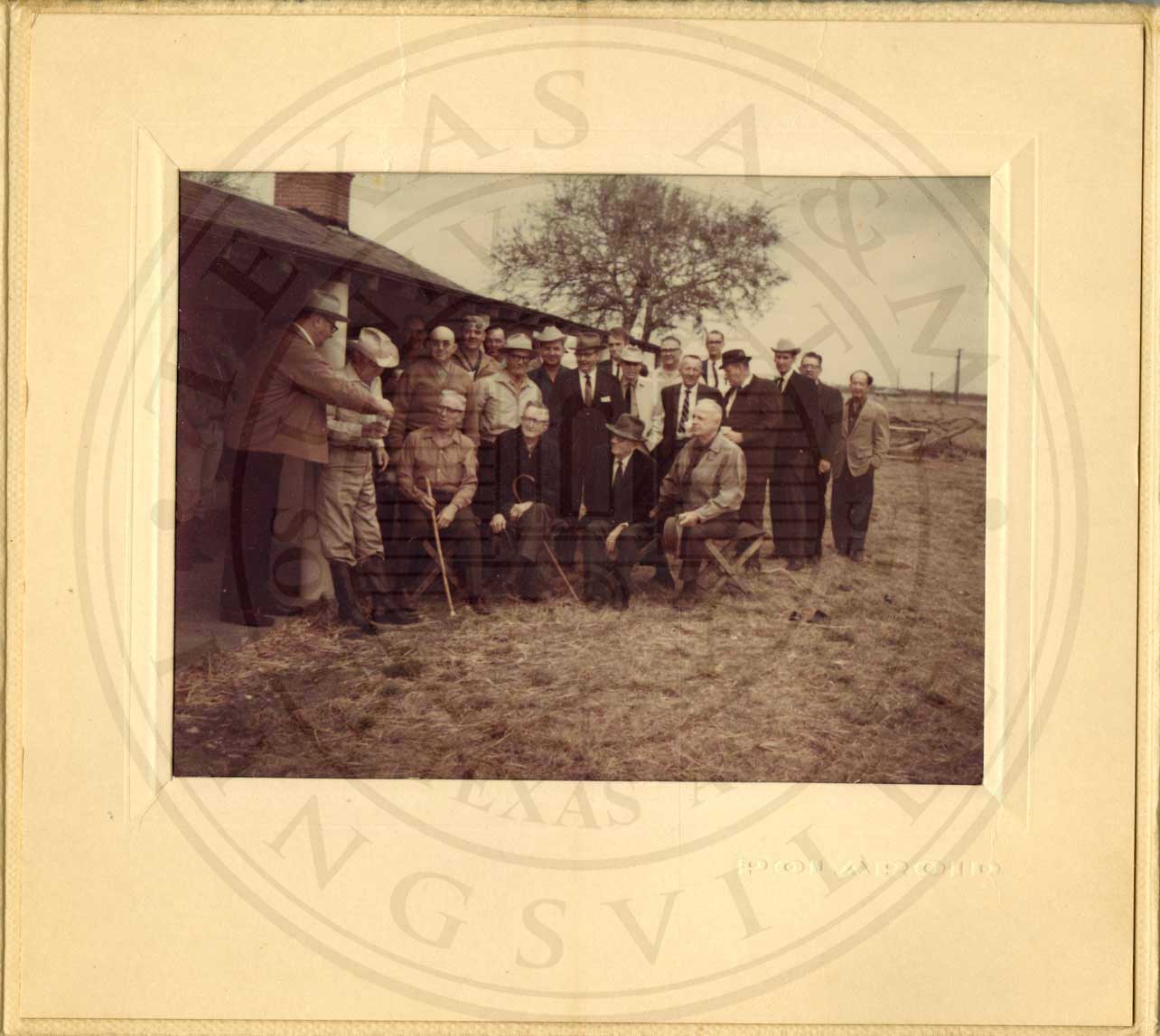 22 unidentified men standing and sitting at the King Ranch. First one on left seated is L.C. McRoberts, first man standing on left is Otto Zwernemann then Dick Kleberg, Otis West is in the suit and tie standing in the middle, possibly Clyde Allen Sr. seated next Otis West. This photograph is thought to be taken off of Buisness Road 77 across from Celanese. |