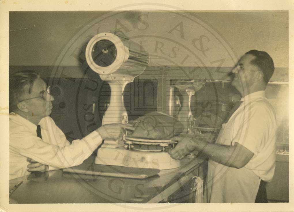 L.C. McRoberts and Otto Zwernemann at the butcher shop weighing a chunk of meat |