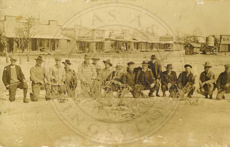 Fifteen unidentified men kneeling in front of buildings possibly Kingsville or somewhere in Idaho |