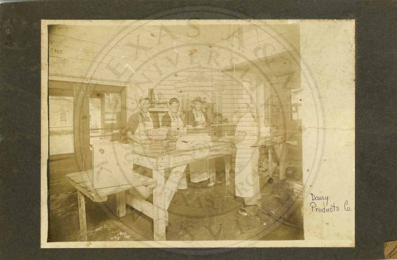 Four unidentified men standing around a table at the Dairy Procucts Co. |