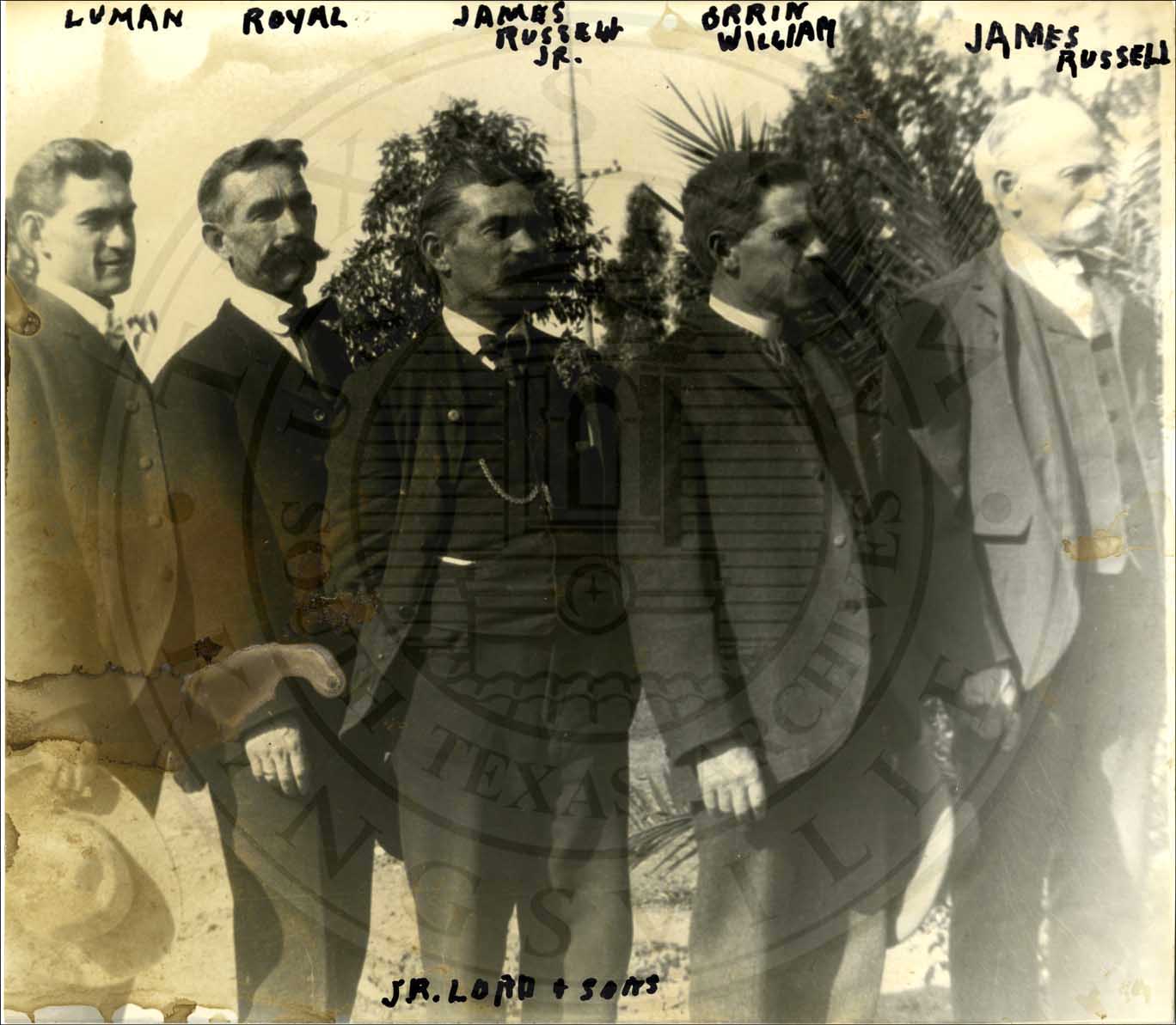 Copy of photo of family. Includes (l-r) Luman, Royal, James Russell, Jr. Orrin William and James Russell Lord. Taken shortly before 1862 when Luman enters the army. Caption on back reads, "Walter was cut off this picture." |