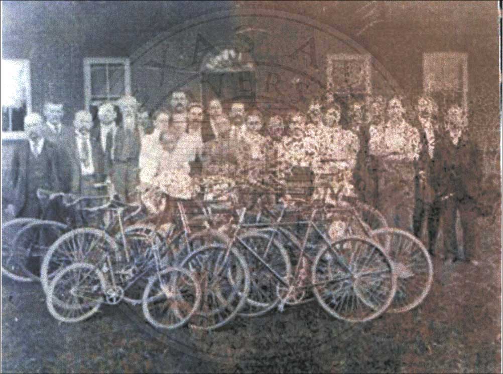 Photocopy of family standing in front of home with bicycles. |