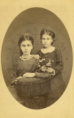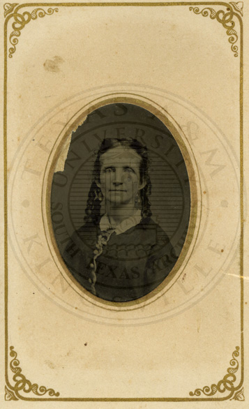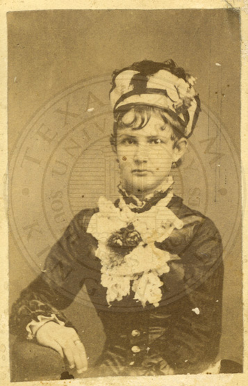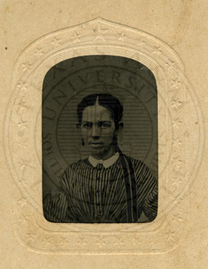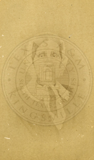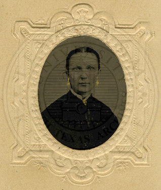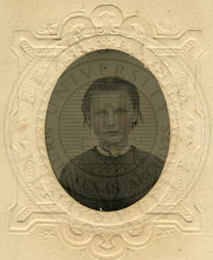 "Courtney Simons" written on back, mounted on paper with a embossed starred shield framing photo on paper. "Potter's Patent March 7, 1865" embossed on side of paper frame. |
