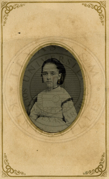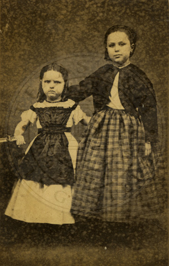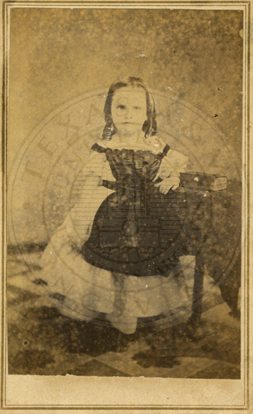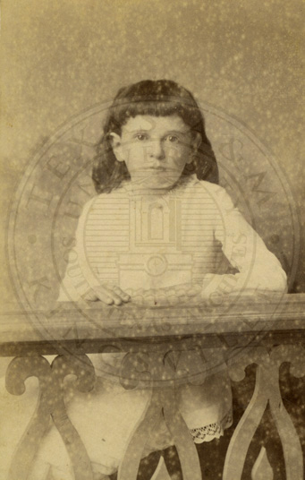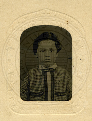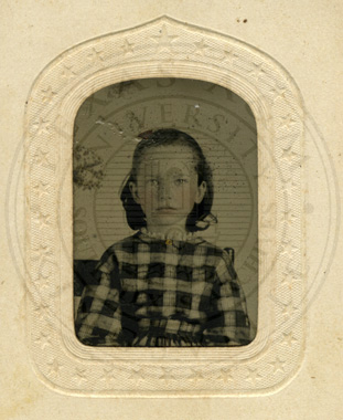 A little girl with a checkered dress, she has tinted rosey cheeks, her hair in the front is combed back, in the back it is loose, mounted on paper with a embossed starred shield framing photo on paper. "Potter's Patent March 7, 1865" embossed on side of paper frame. |
