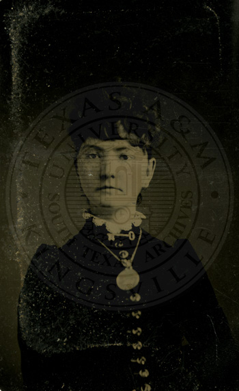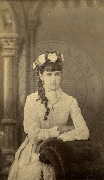 Larena Mathews, mounted onto paper with oval frame around portrait |