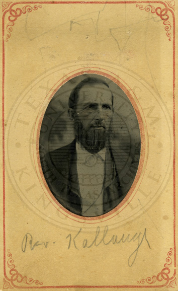 "Rev. Kallaugh" written on front, framed in beige and red paper holder with oval border around tin type. |