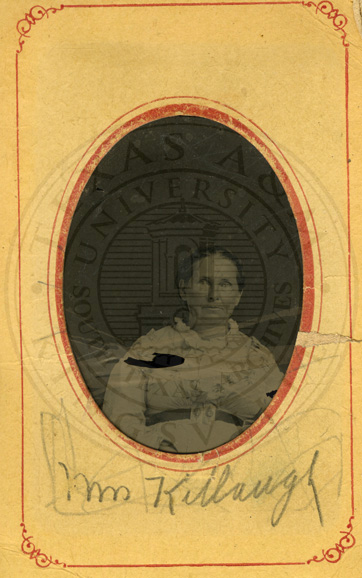 Mrs. Kallaugh, written on front, framed in beige and red paper holder with oval border around tin type. |