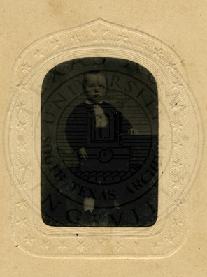 A little boy with a suit on, he's sitting down on a chair, mounted on paper with a embossed starred shield framing photo on paper. "Potter's Patent March 7, 1865" embossed on side of paper frame. |