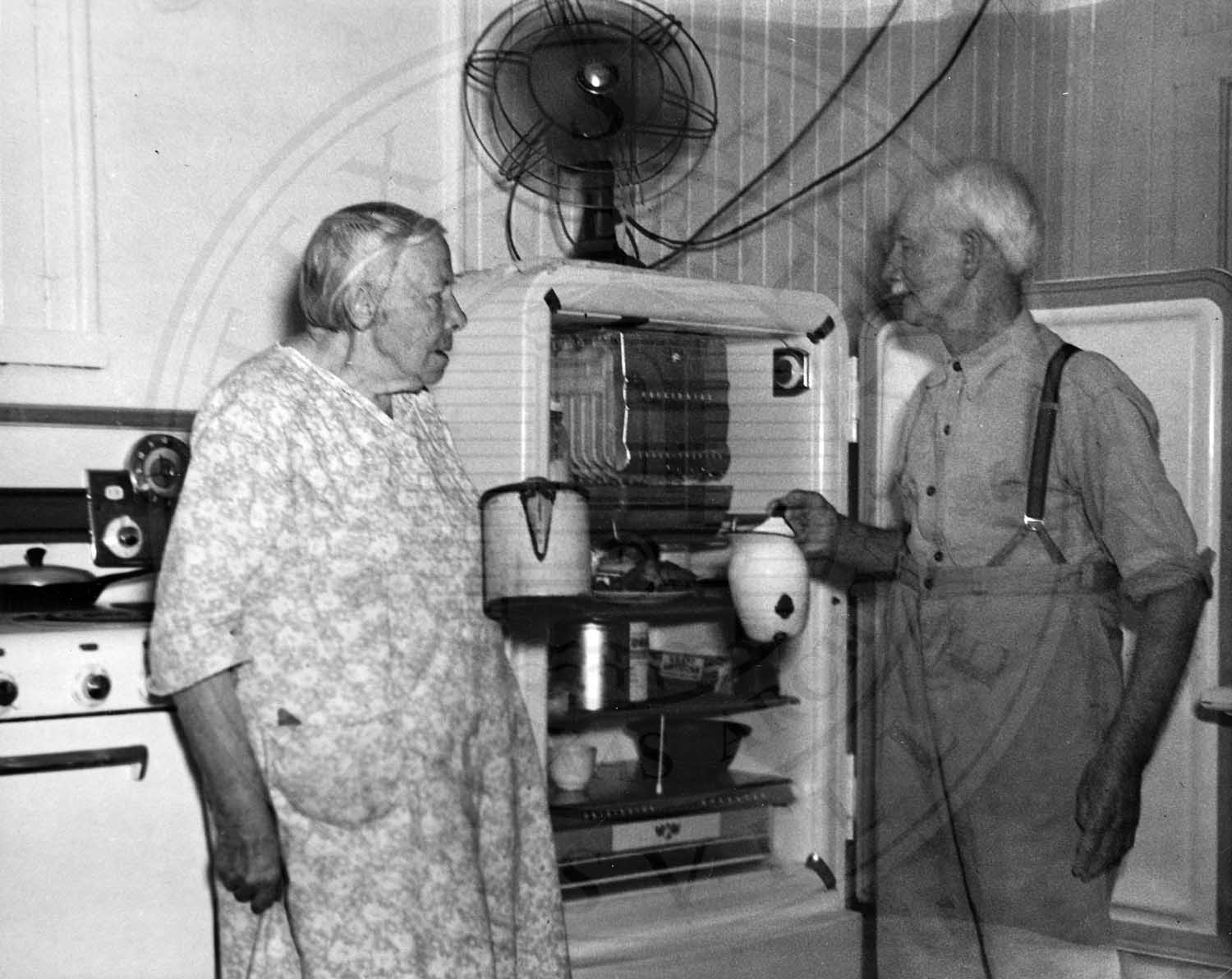 Elderly couple (Martin and Carrie Christopher) in kitchen in the 1940s. One of the first people in Kingsville to get electricity.(2 copies) |
